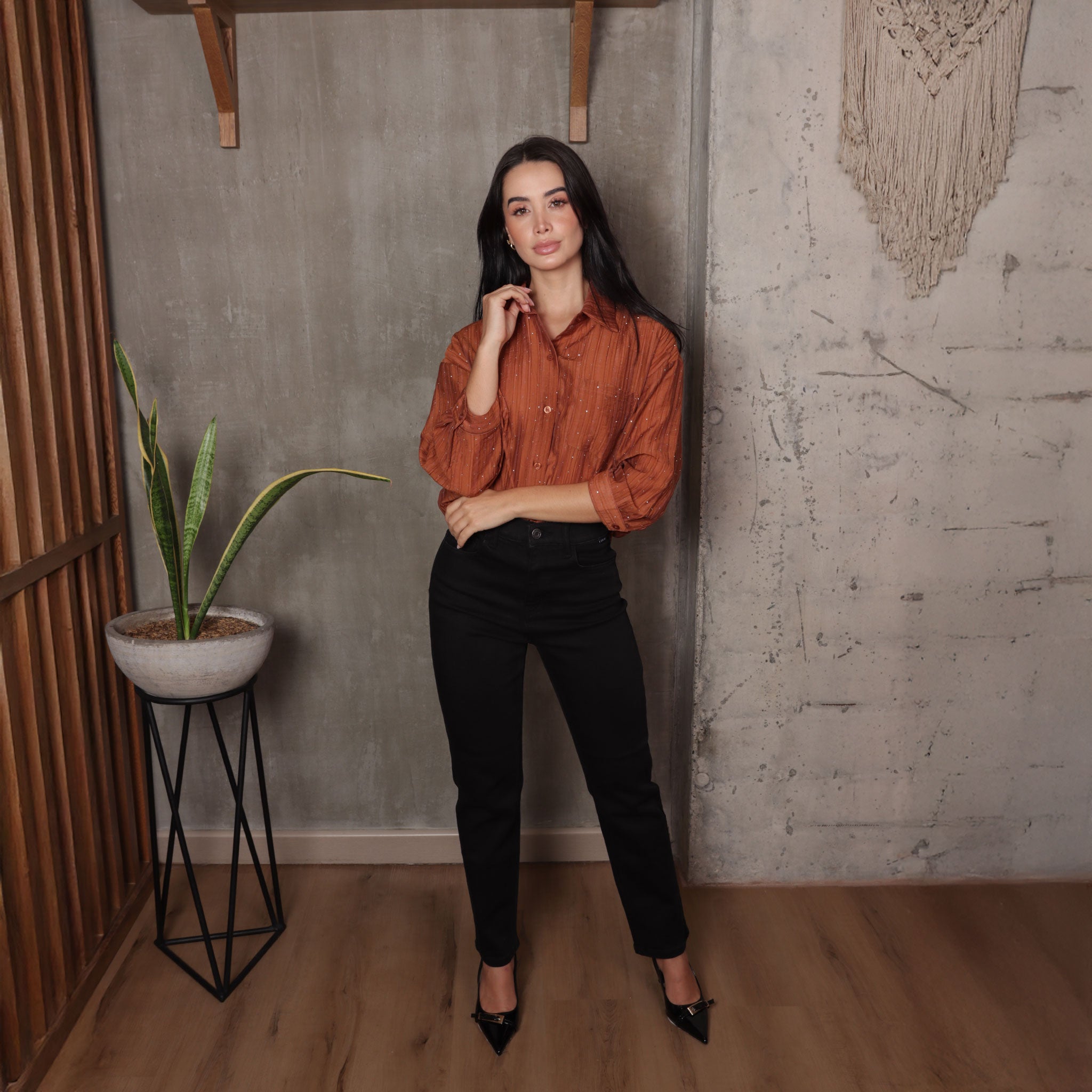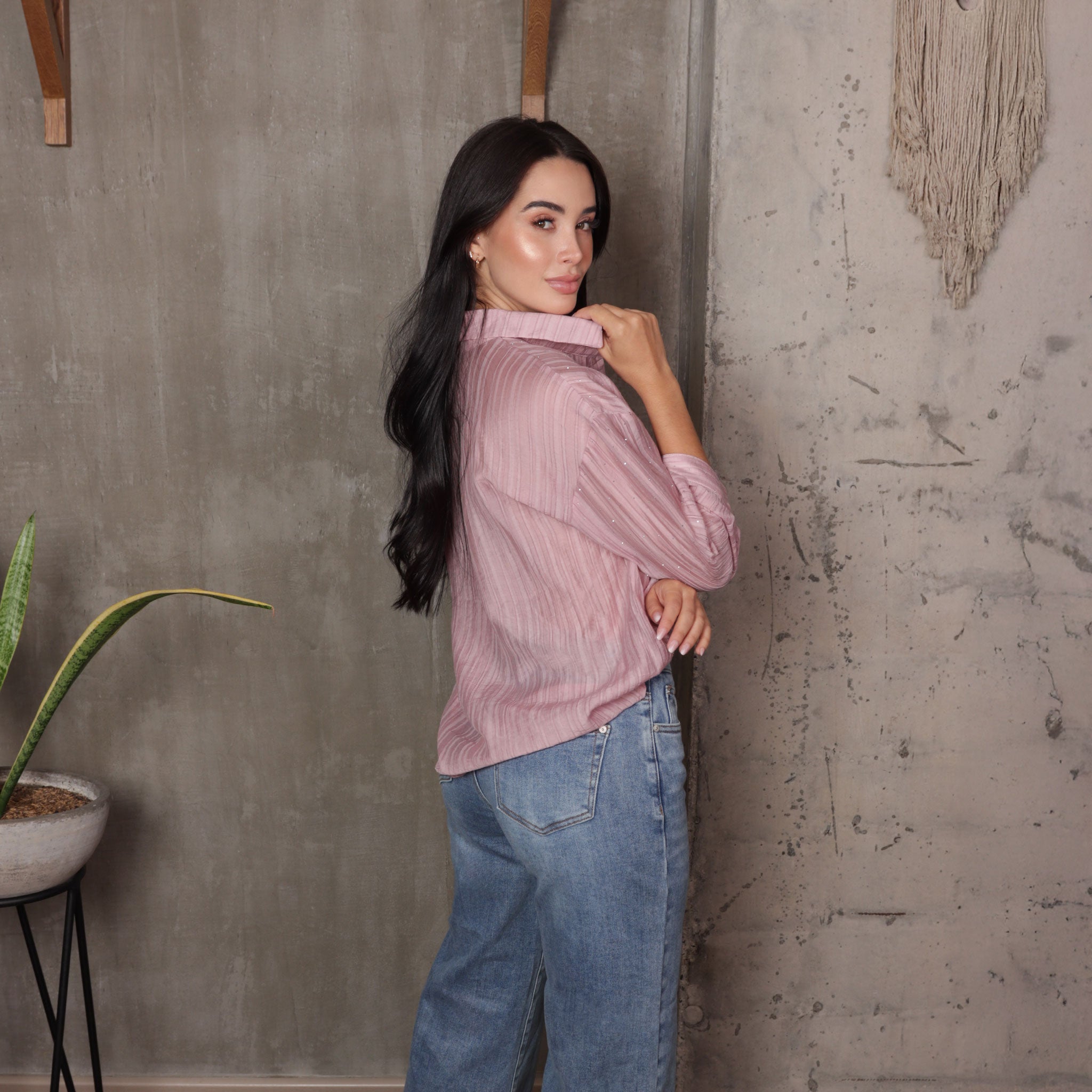 Blusa de silueta relajada en tejido liviano con textura de rayas finas. Diseño con cuello clásico, botones frontales y mangas largas con puño.