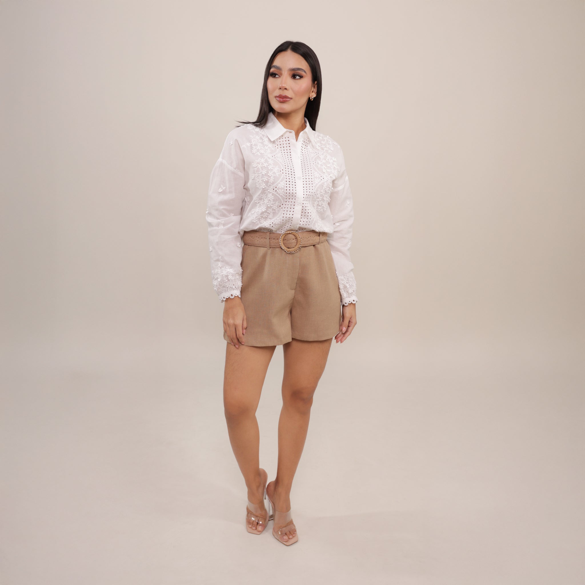 Camisa ivory de manga larga confeccionada en tela de ojalillo que aporta un aire romántico y sofisticado. Su diseño incluye cuello clásico, botonadura completa y delicados calados en la parte frontal, que realzan su estilo femenino y versátil.
