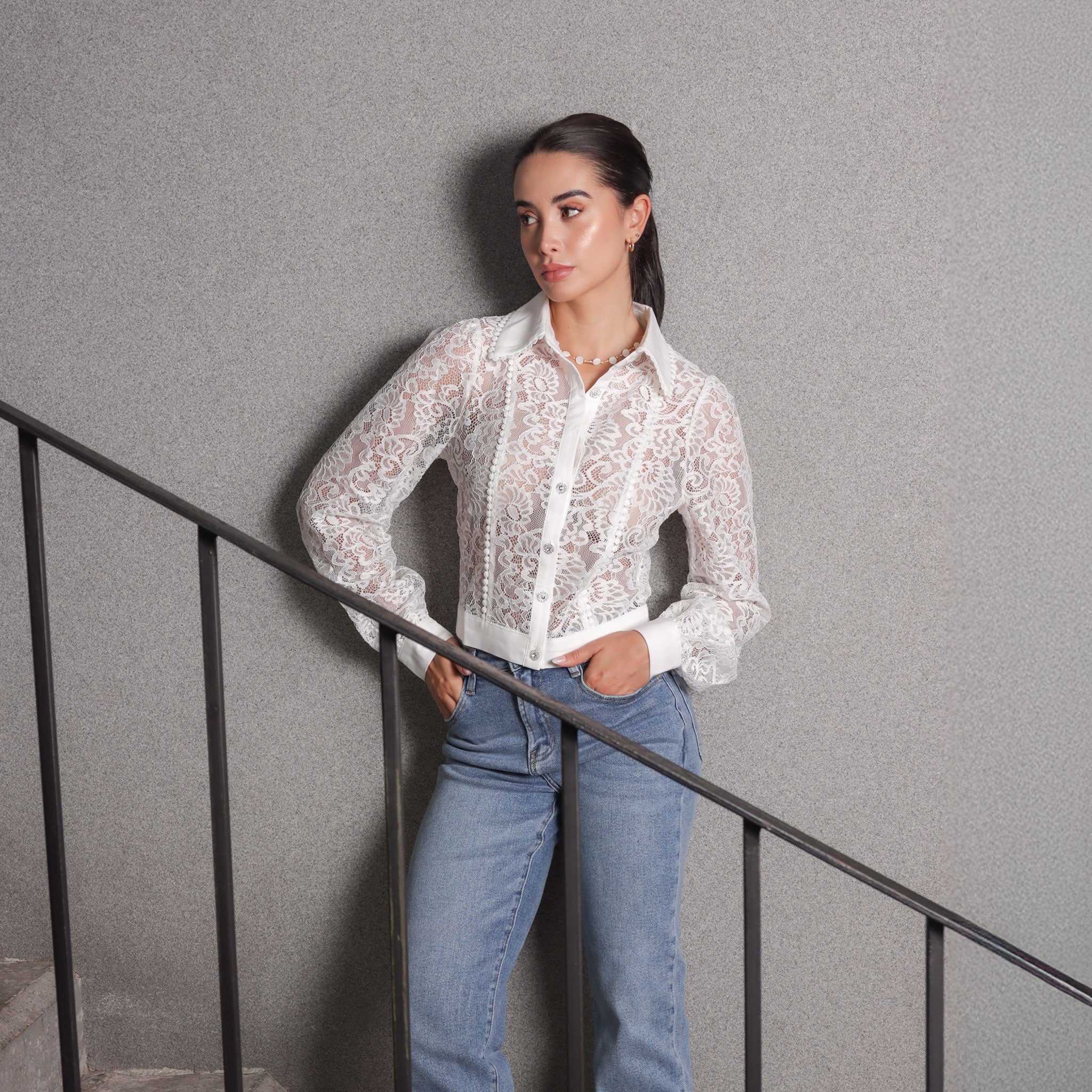 Blusa en encaje Ivory con delicados detalles florales. Diseño de manga larga con puños y cuello camisero en satín, botones frontales decorativos y ajuste entallado que realza la figura.