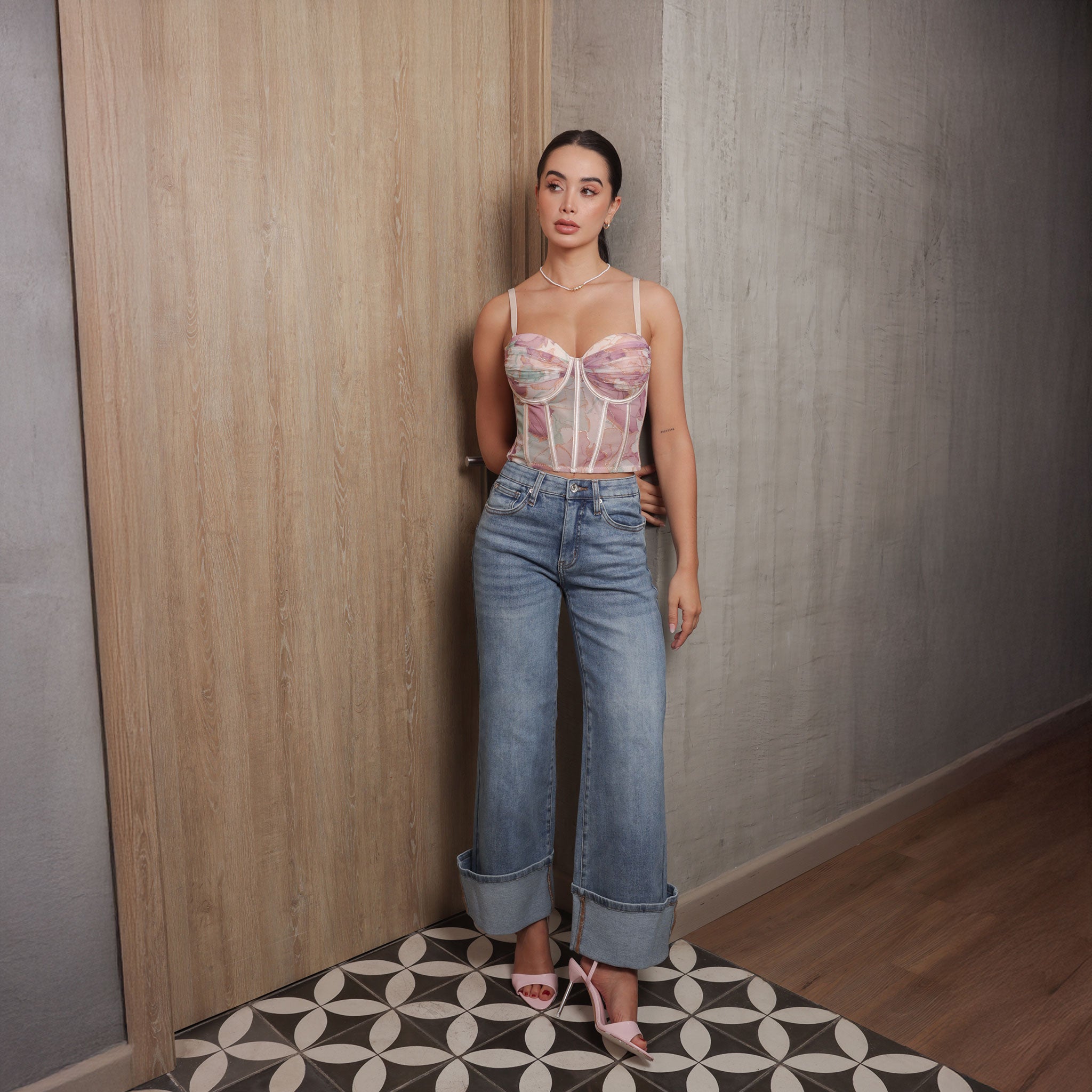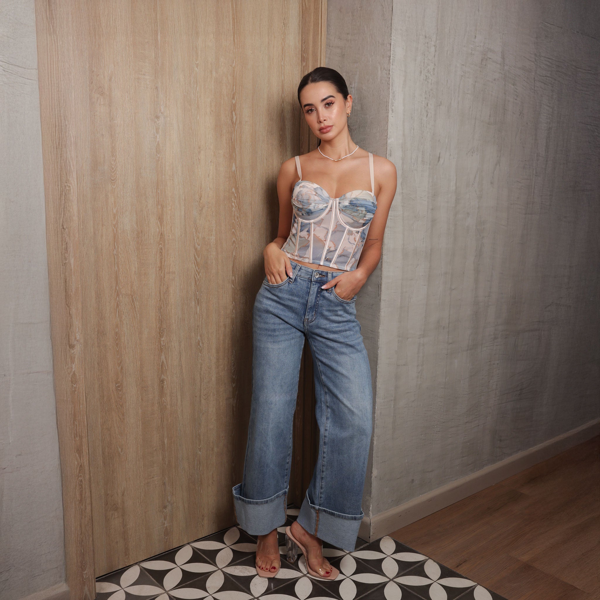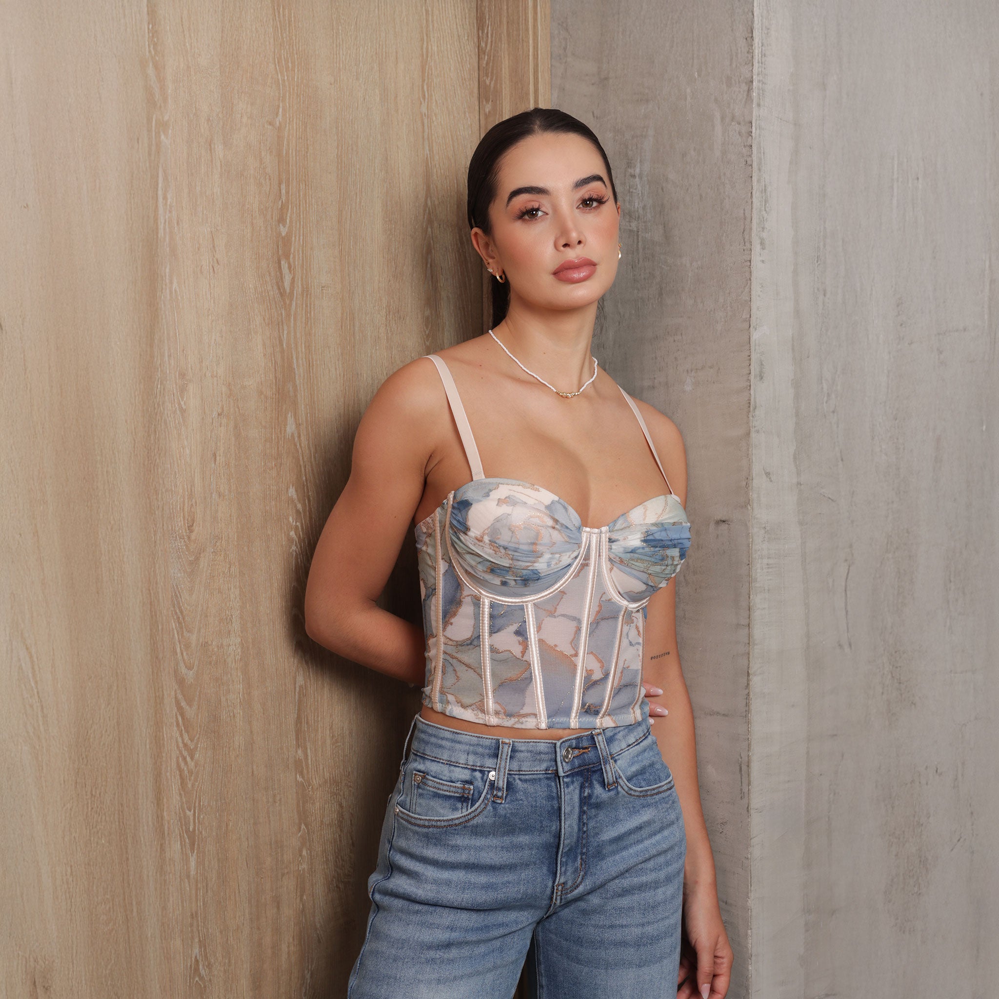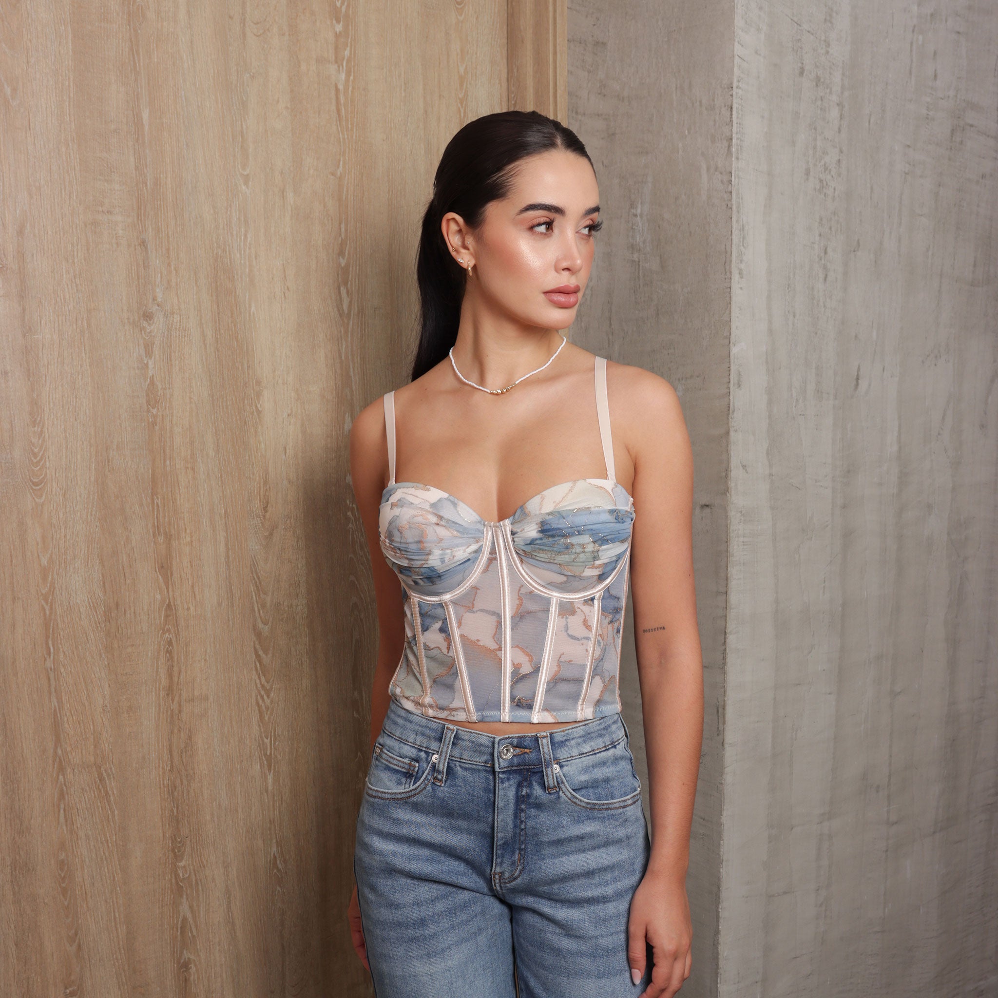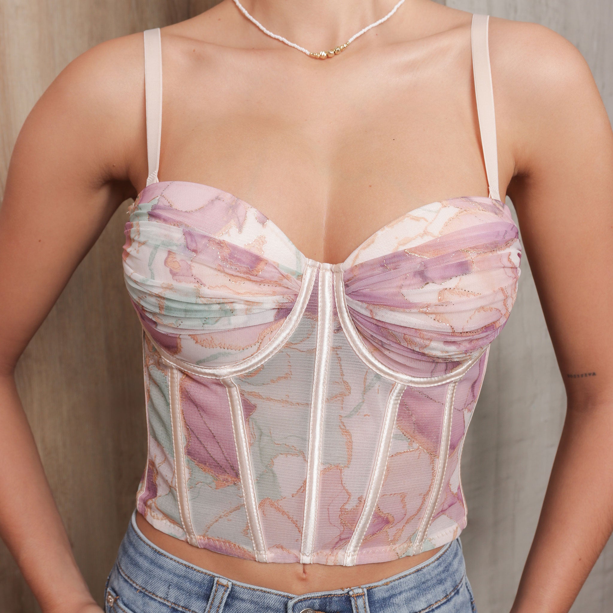 Corsé floral con estructura tipo bustier y varillas que realzan la figura. Confeccionado en tul translúcido con estampado suave y tonos pastel, combina delicadeza y feminidad.