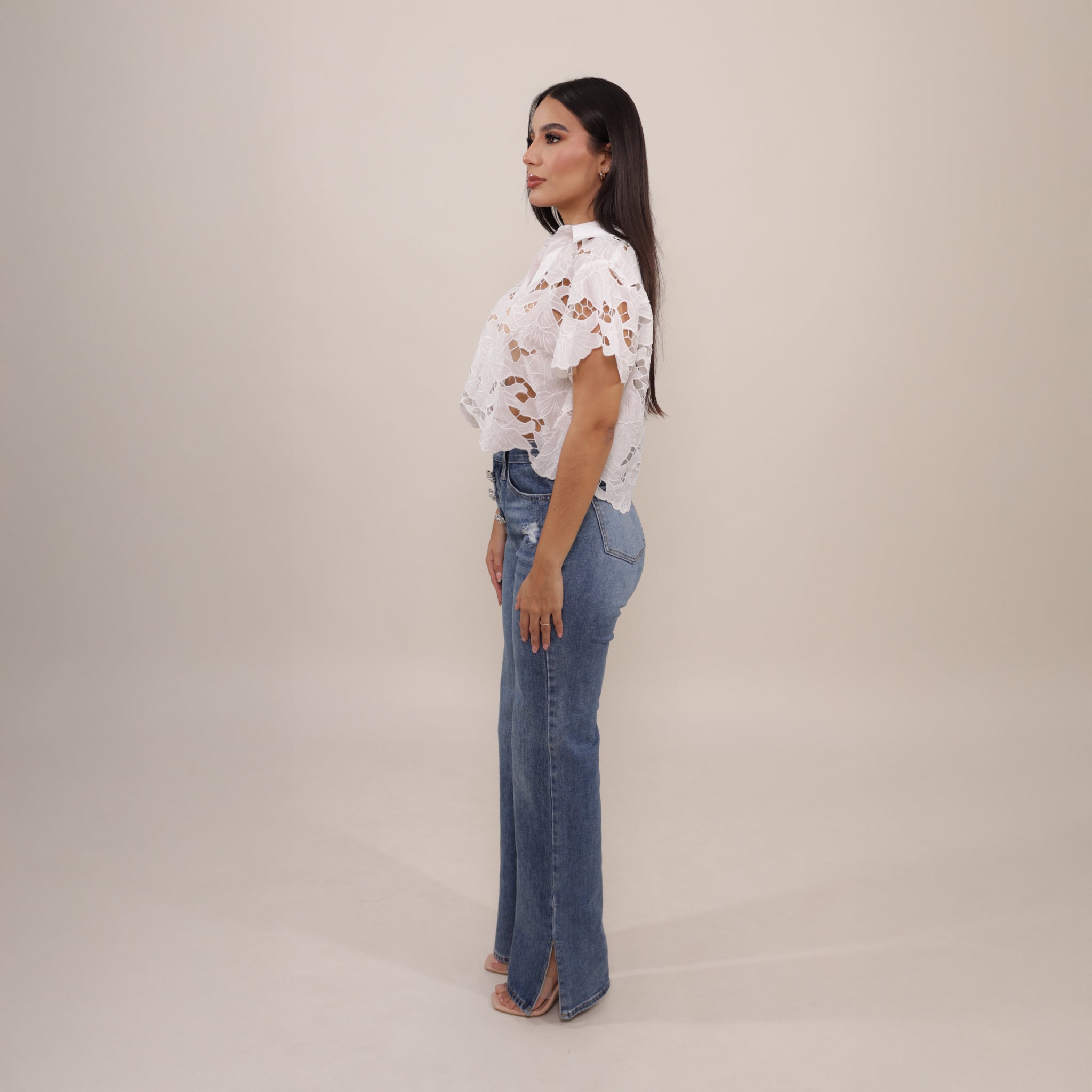 Blusa corta en tela ojalillo blanca con diseño floral calado. Presenta cuello camisero y manga corta amplia, logrando un equilibrio entre frescura y sofisticación. Ideal para looks veraniegos con un aire romántico y elegante.