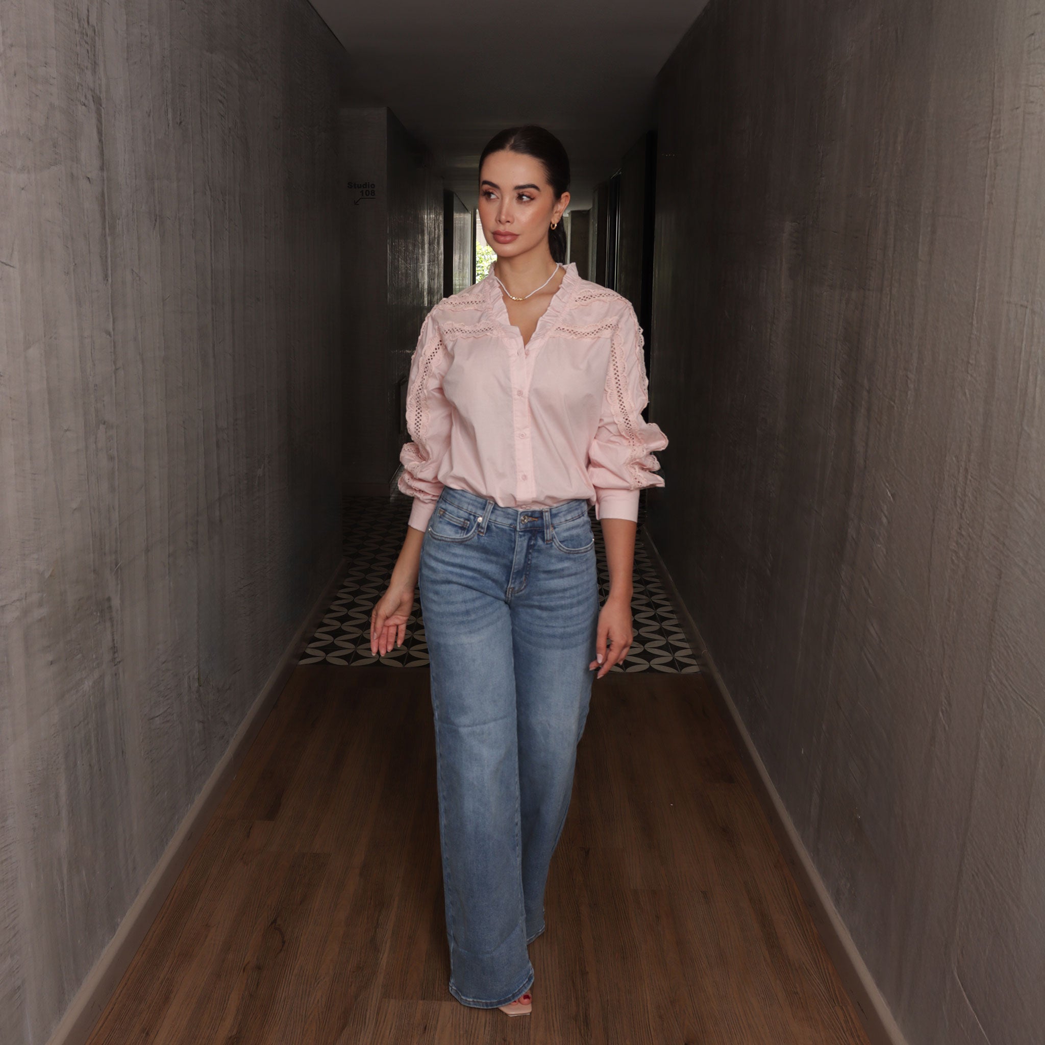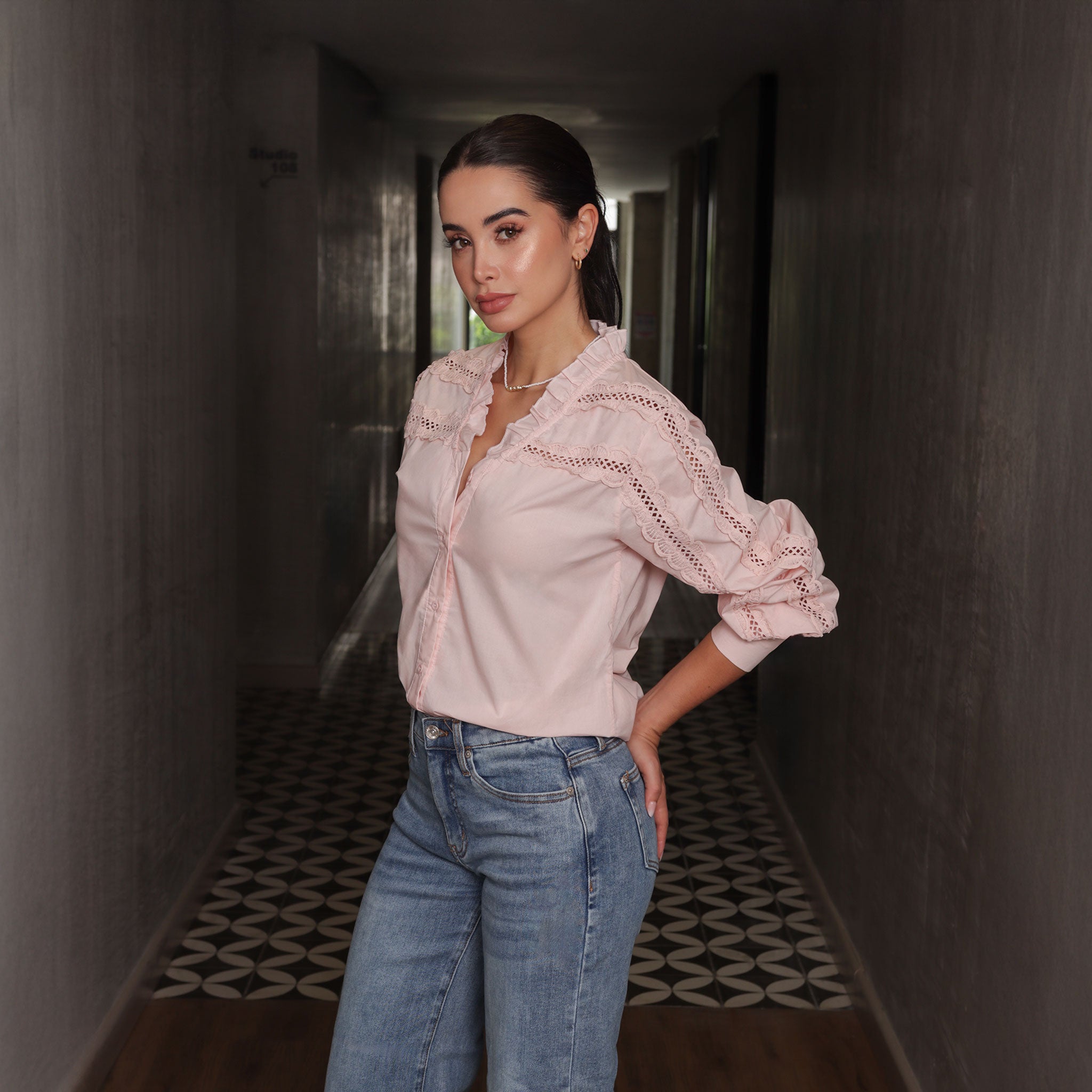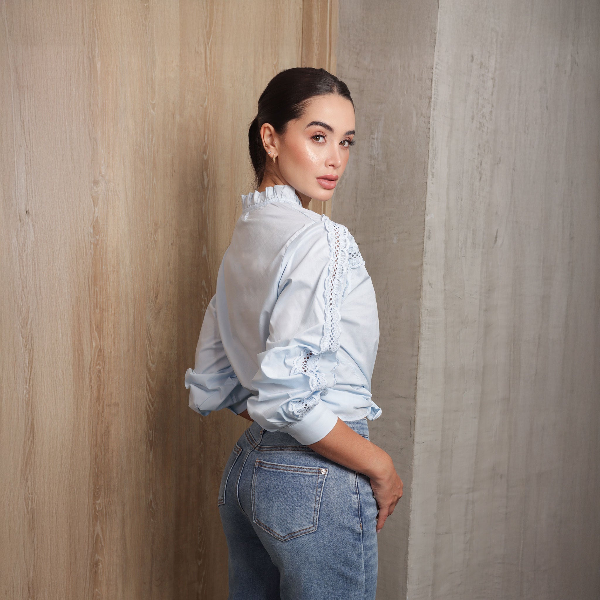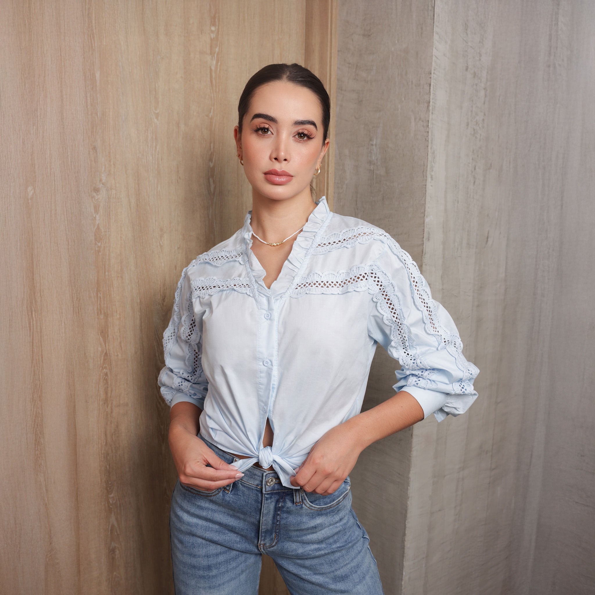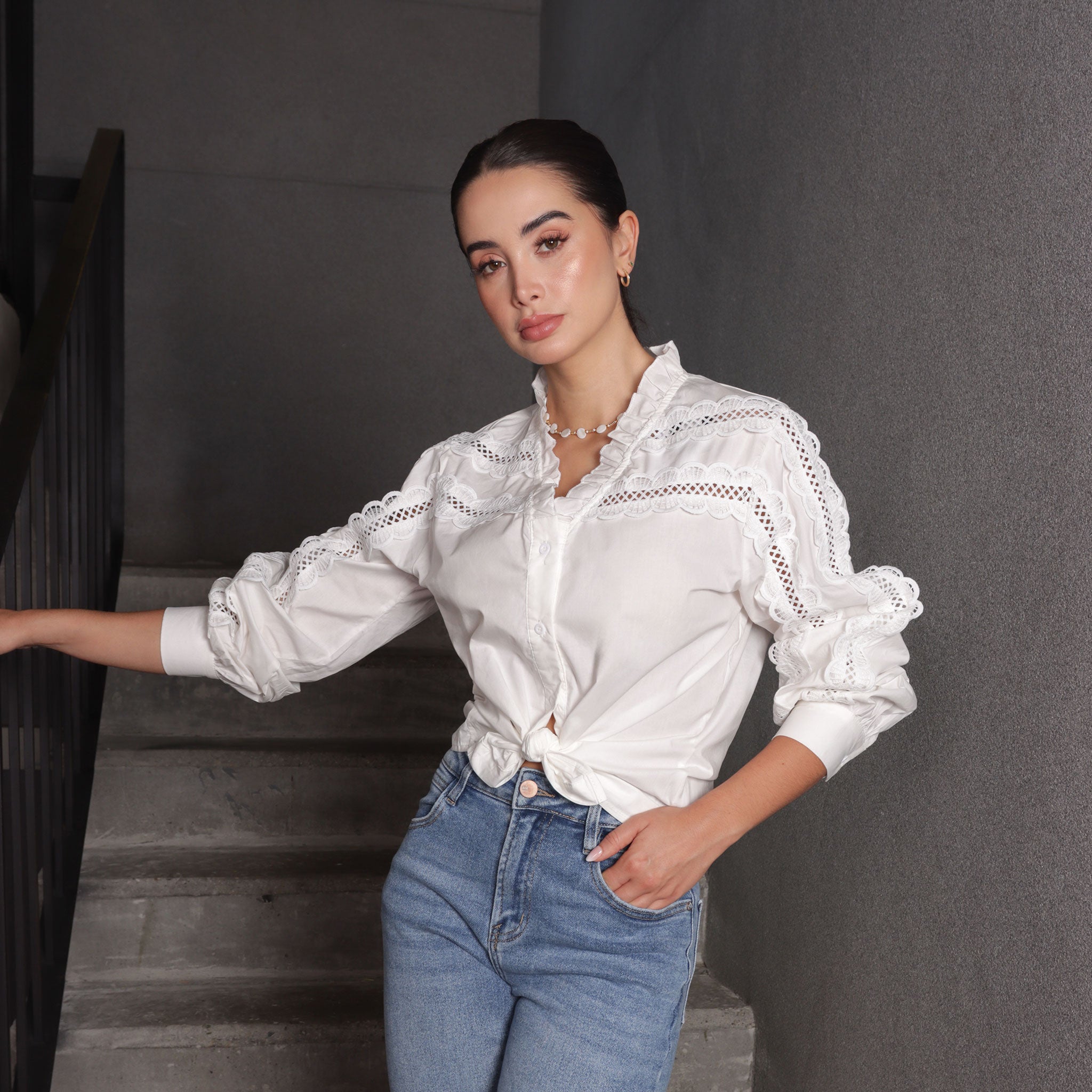 Blusa blanca de manga larga con delicados detalles calados y cuello con volantes.