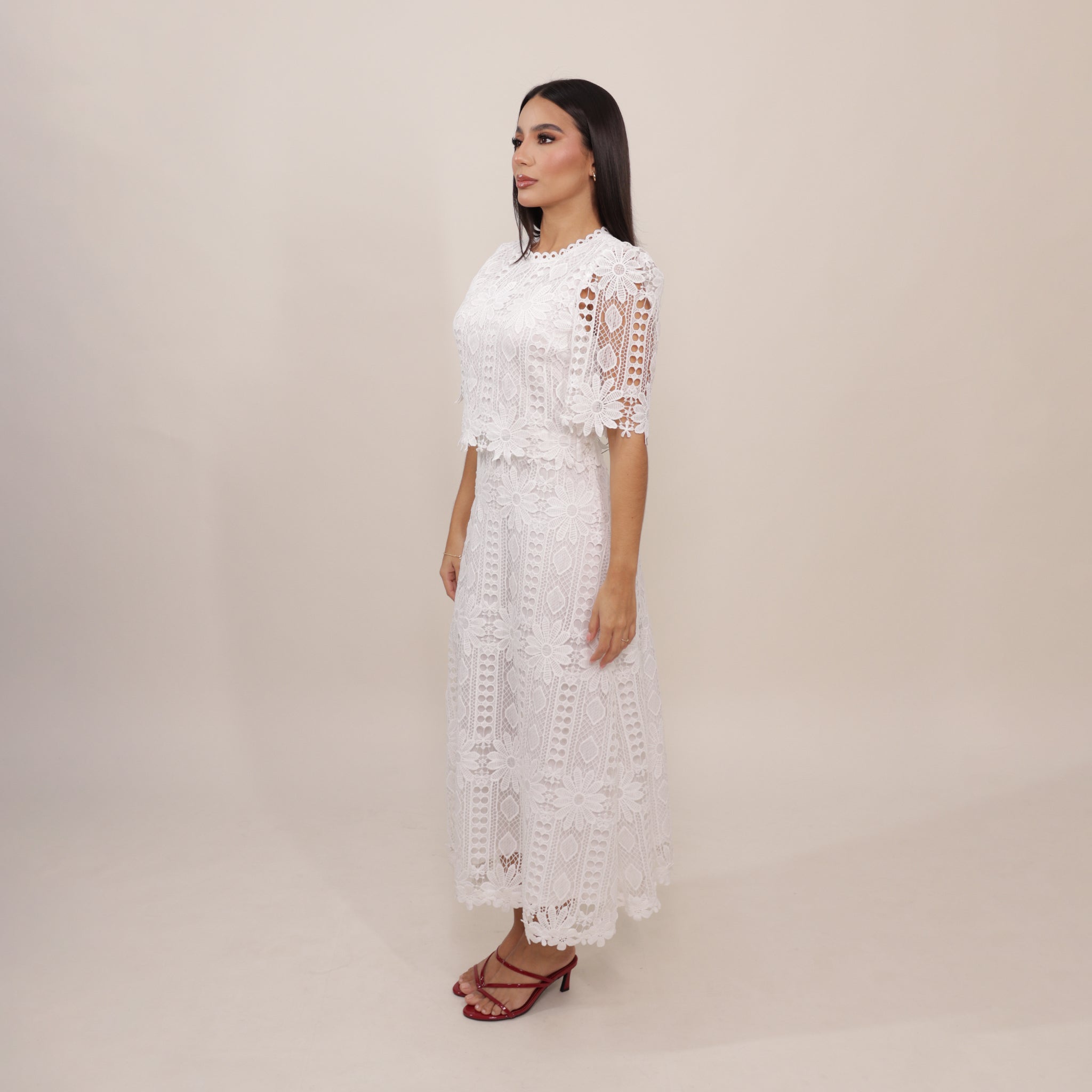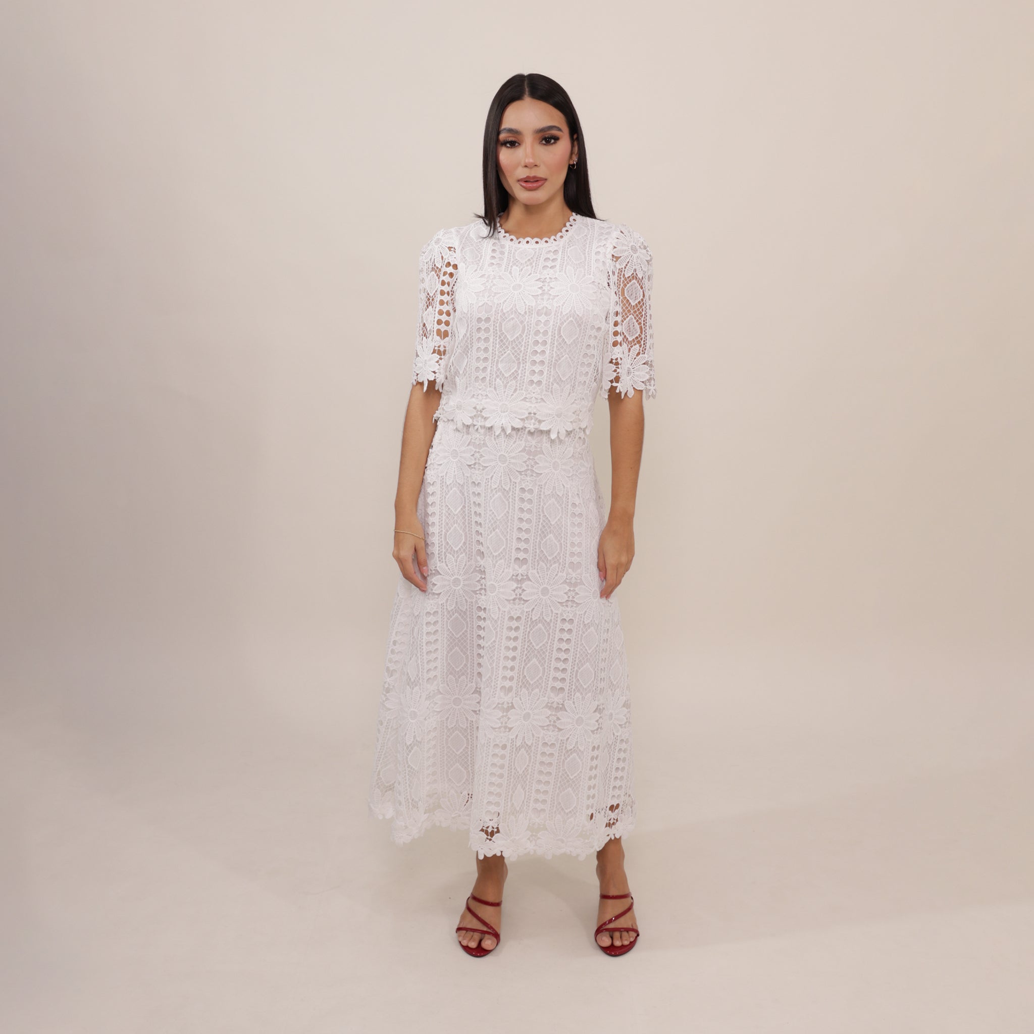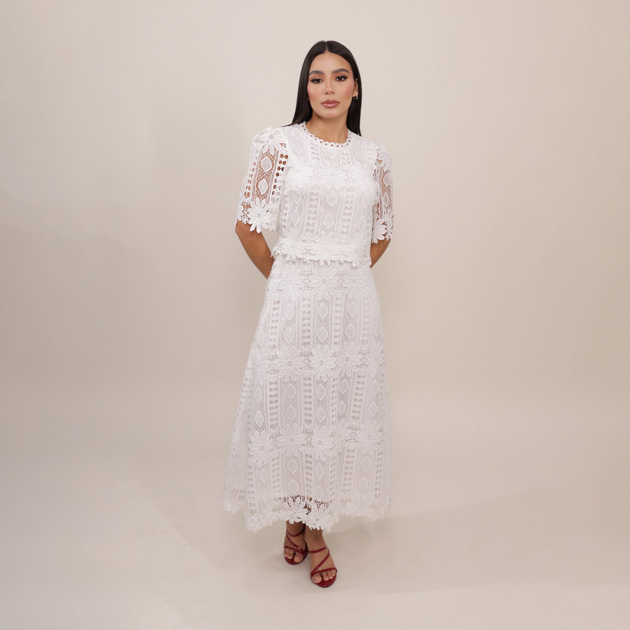 Conjunto ivory confeccionado en delicado encaje guipiur con diseño floral y detalles calados que aportan un aire romántico y sofisticado. La blusa de manga corta presenta una silueta recta con terminados festoneados, mientras que la falda a juego complementa el look con elegancia y frescura.