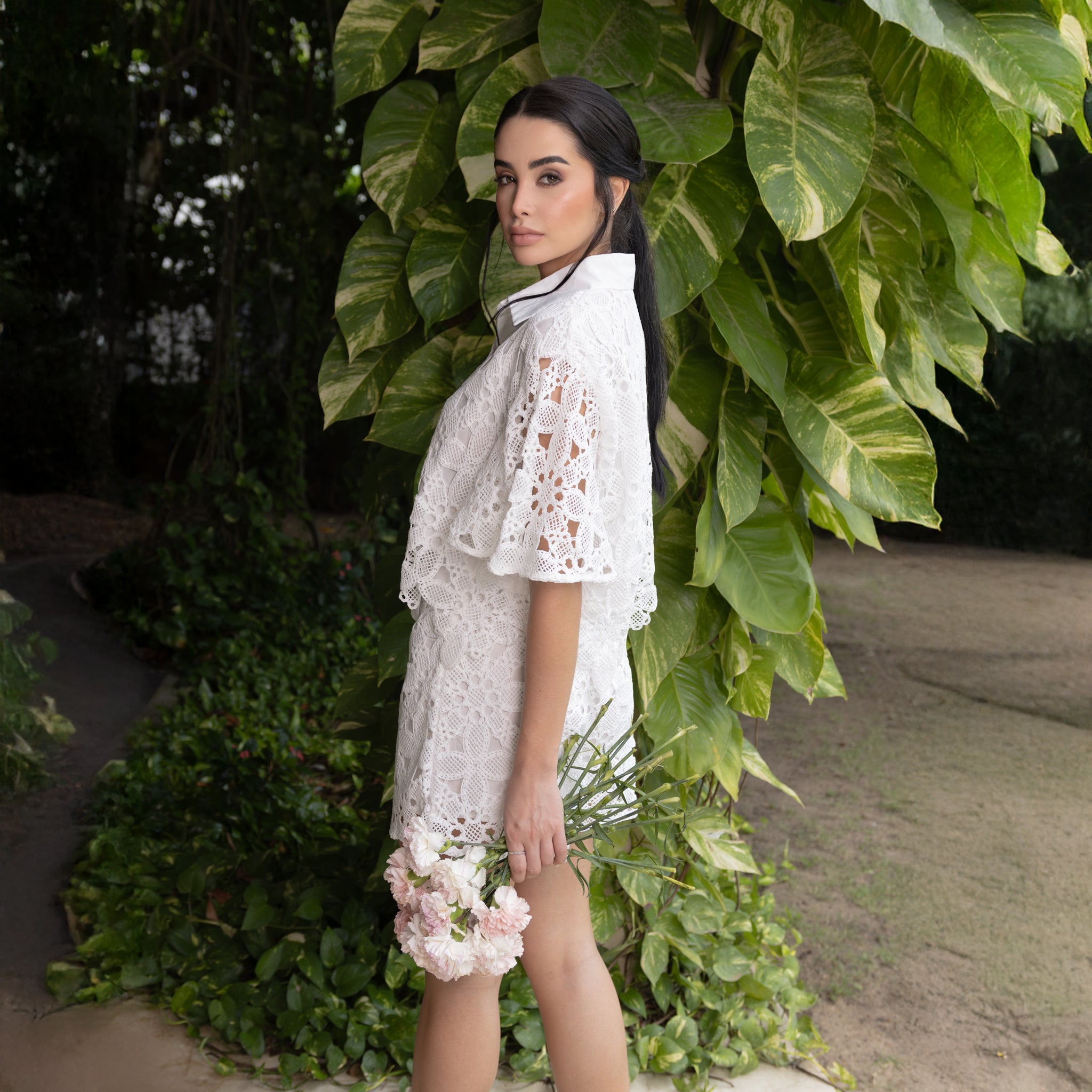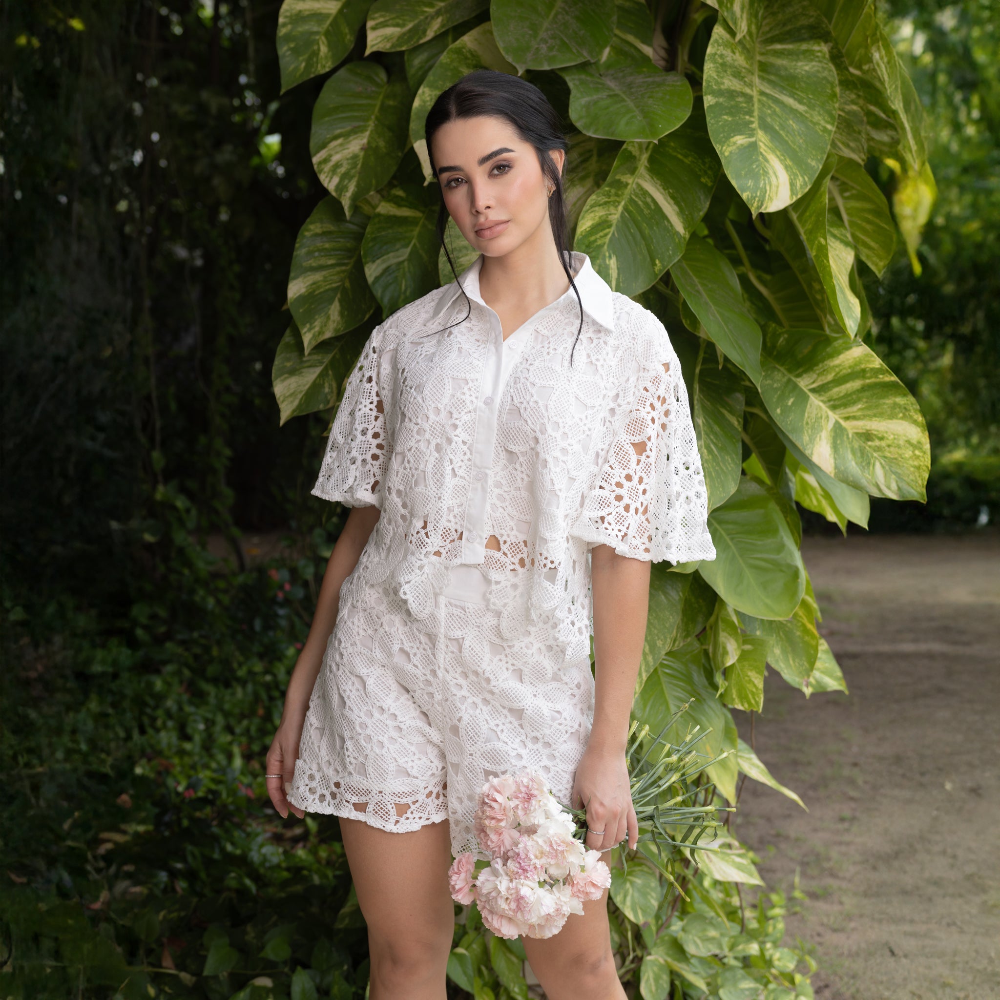 Este conjunto combina frescura, elegancia y textura en una propuesta perfecta para el verano. Compuesto por una camisa de encaje con mangas amplias y cuello clásico, y un pantalón corto a juego de tiro alto, ambos en delicado bordado floral calado.