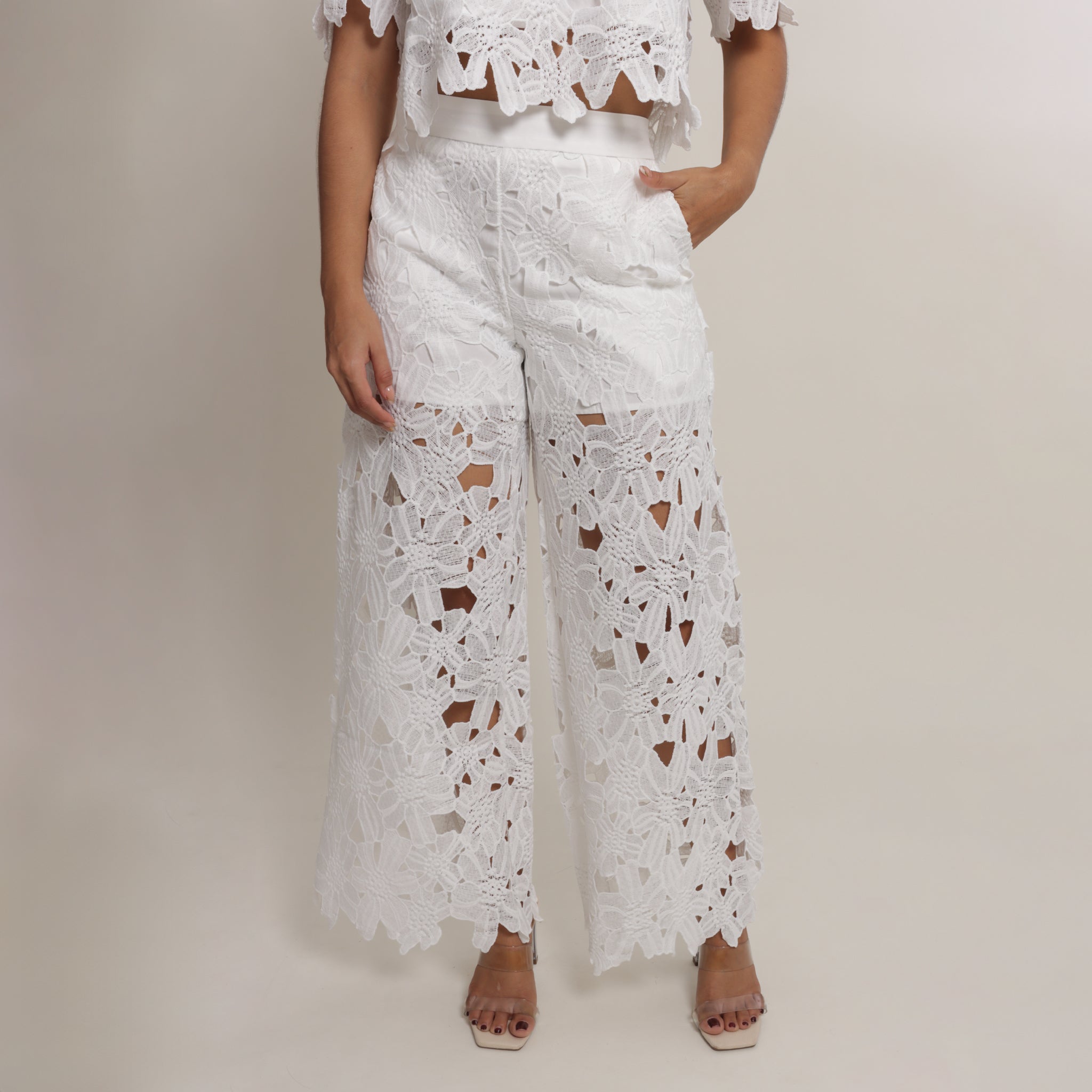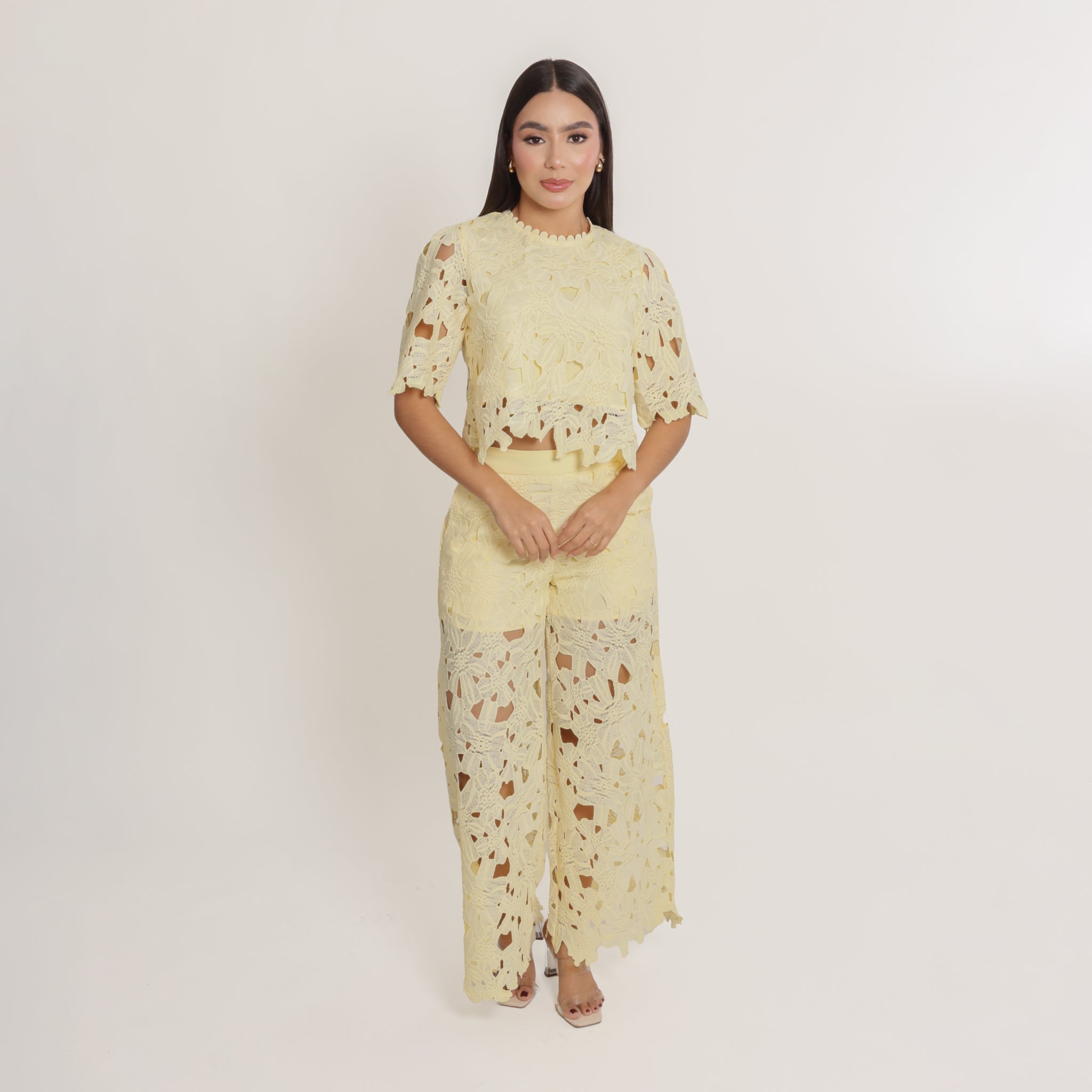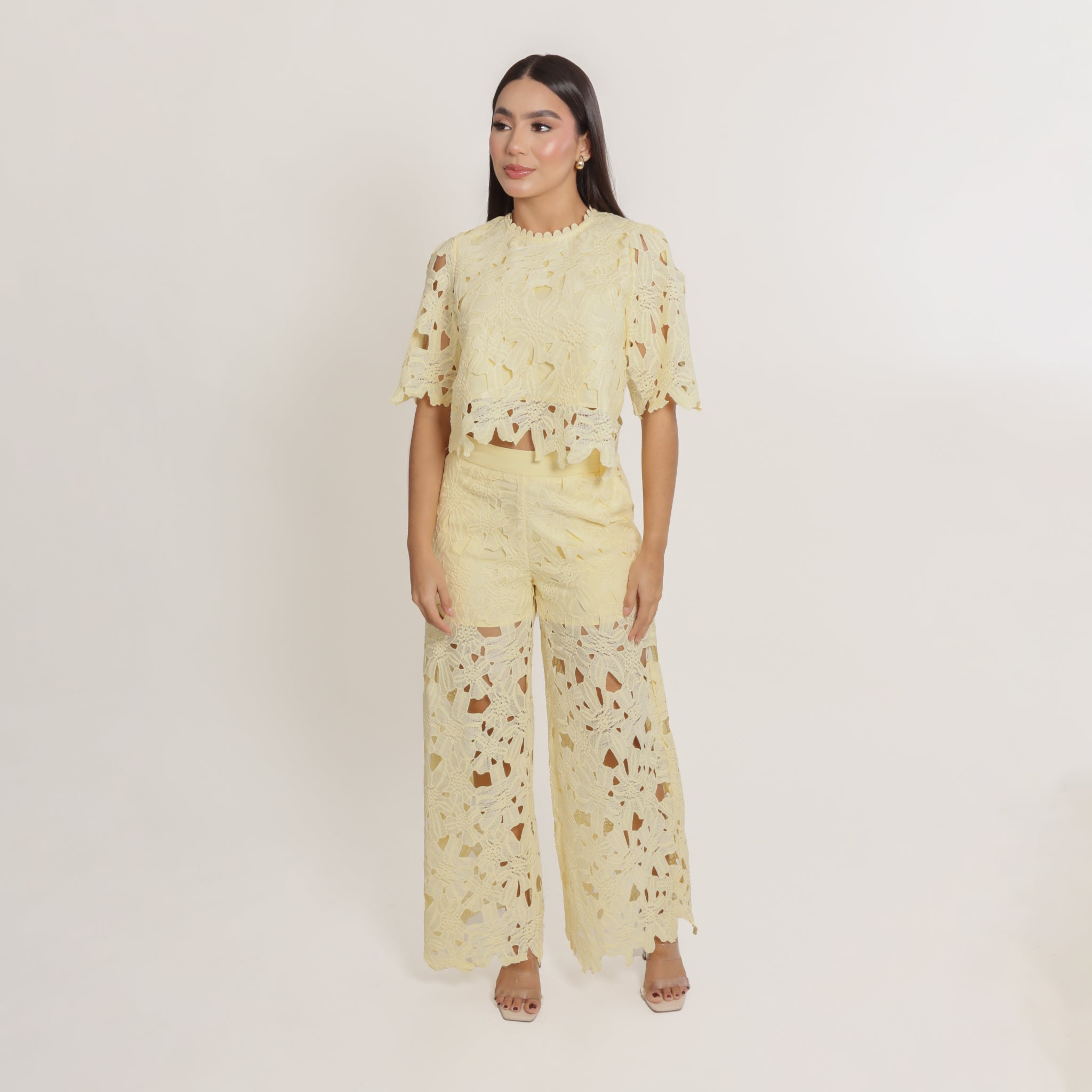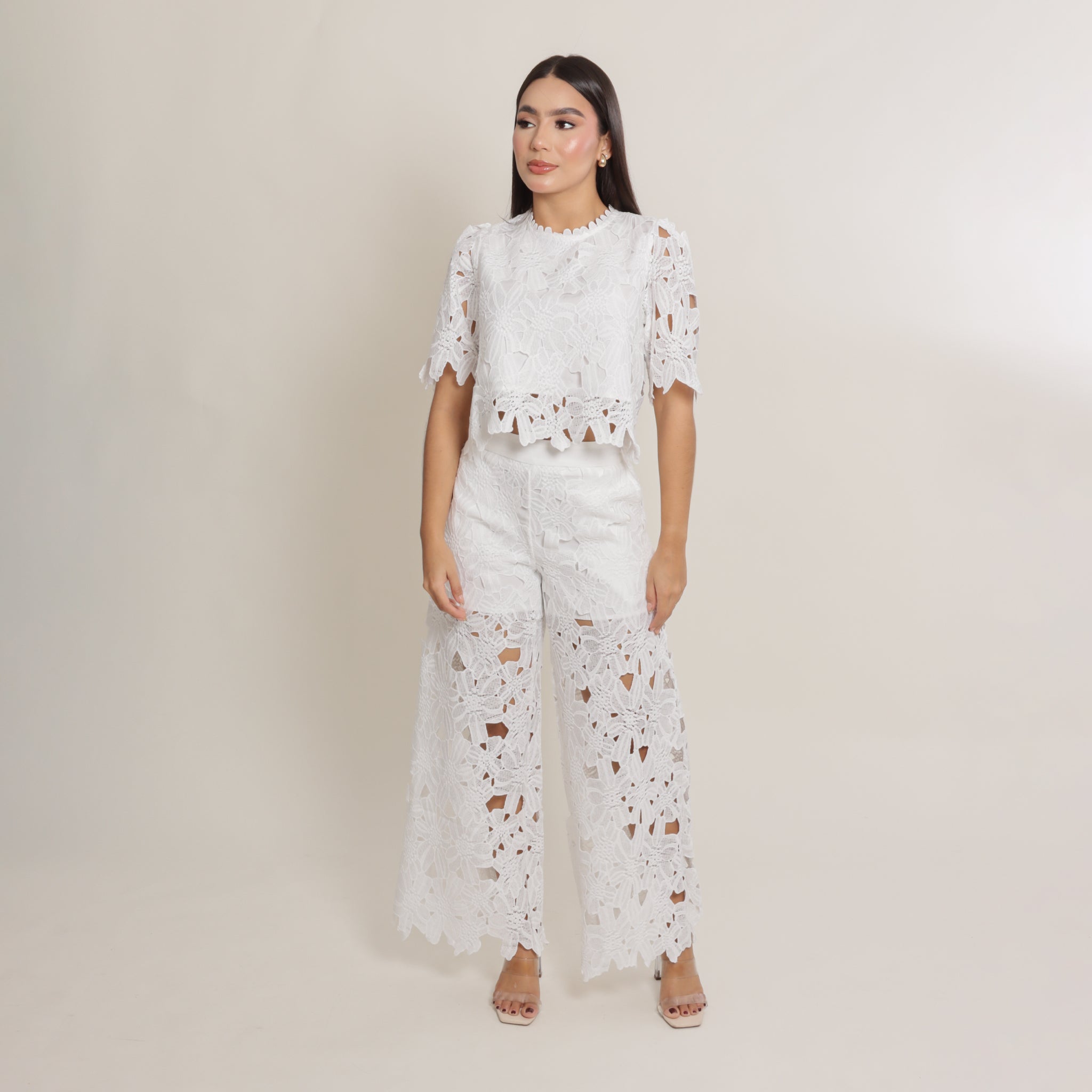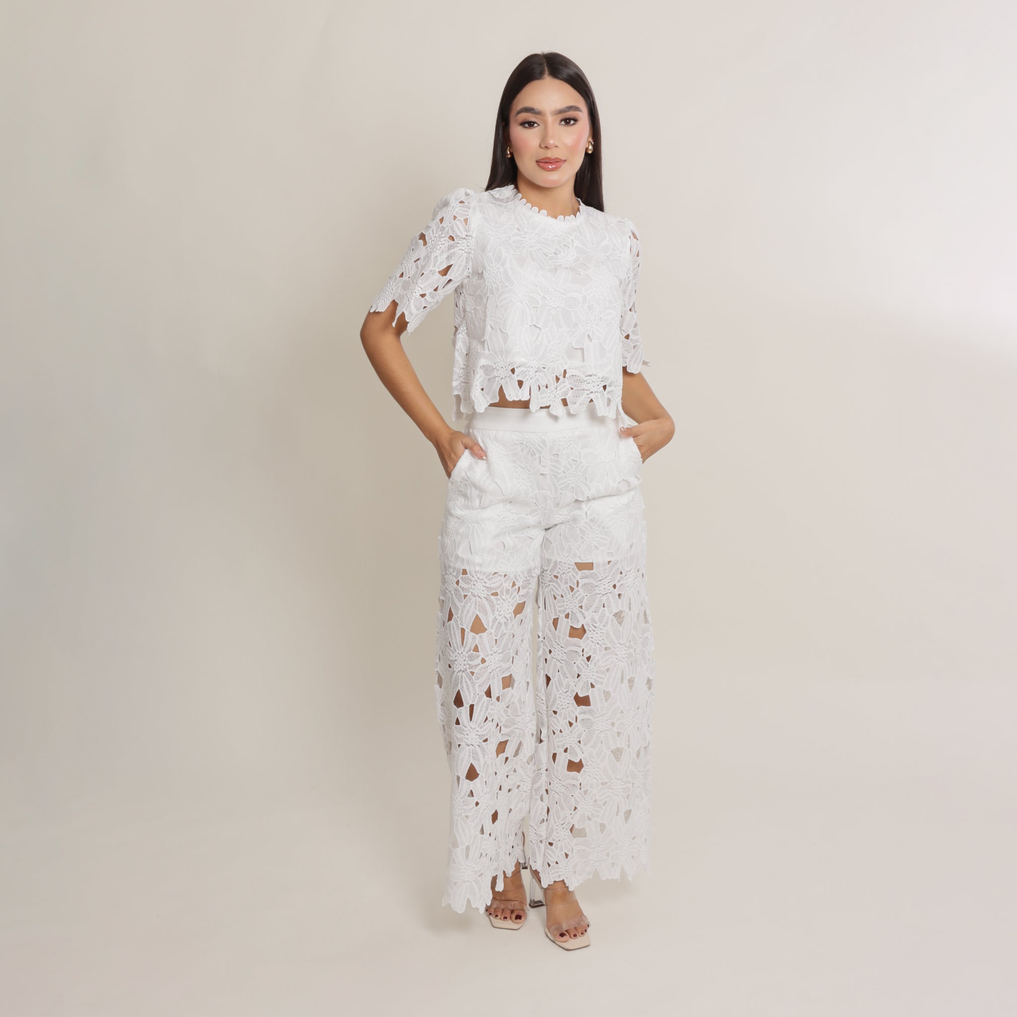 Este conjunto de dos piezas en tela guipiur floral es una opción fresca, moderna y sofisticada para destacar en cualquier ocasión especial. Incluye una blusa tipo crop con mangas cortas y terminaciones caladas, acompañada de un pantalón de tiro alto y silueta amplia, con transparencias estratégicas que aportan movimiento y un toque sensual.