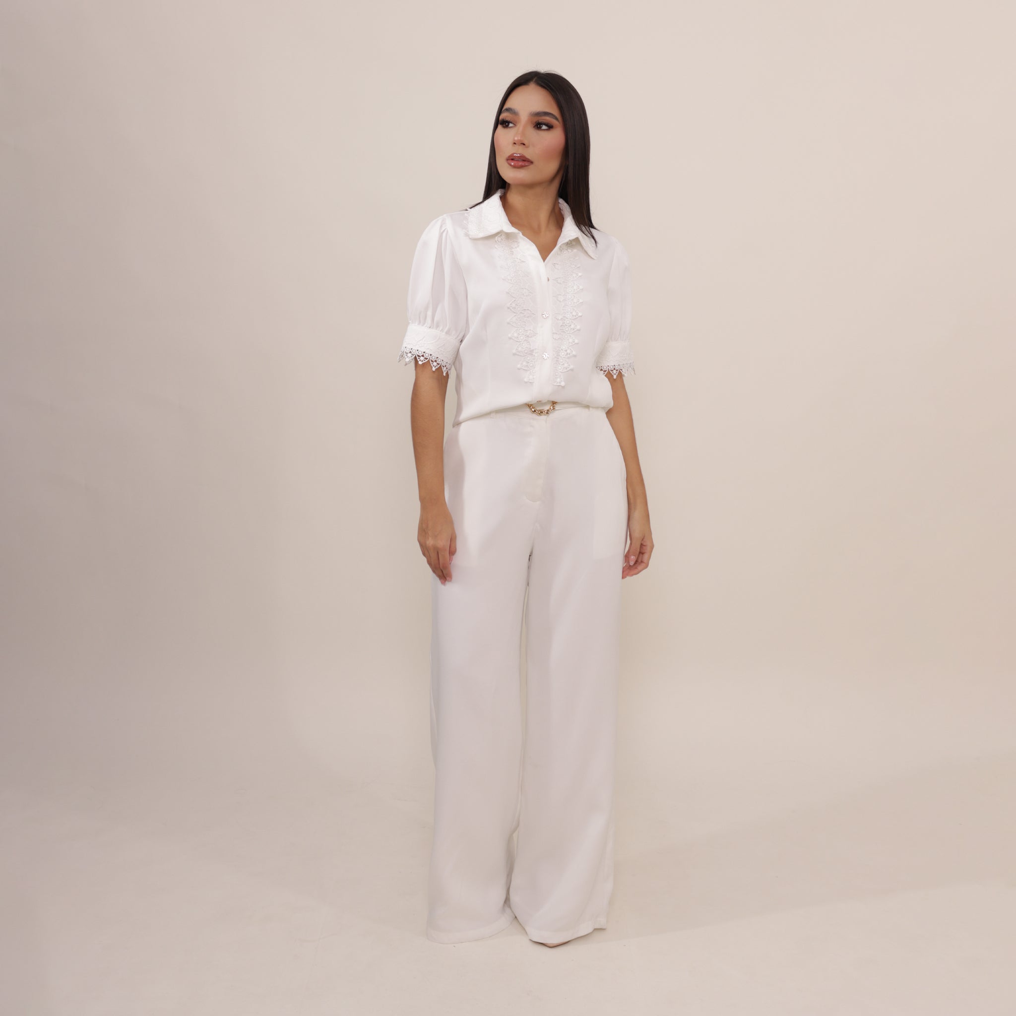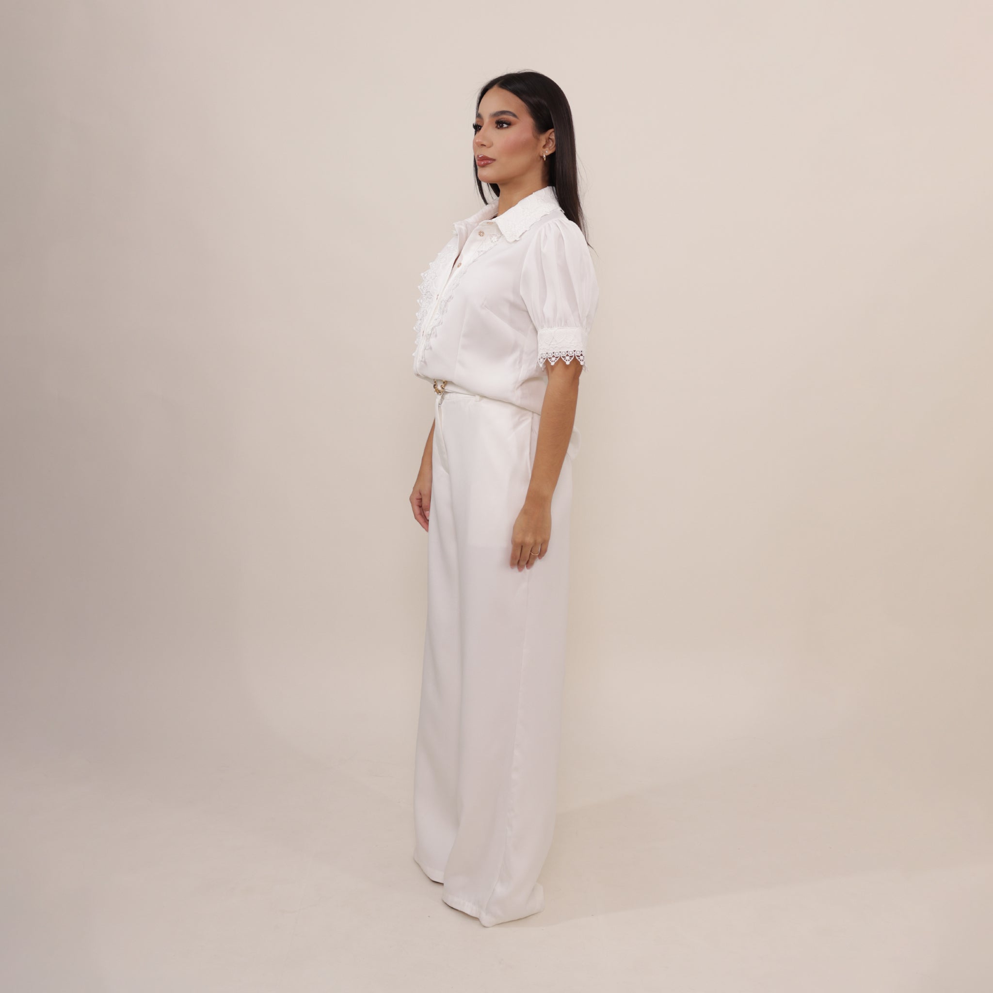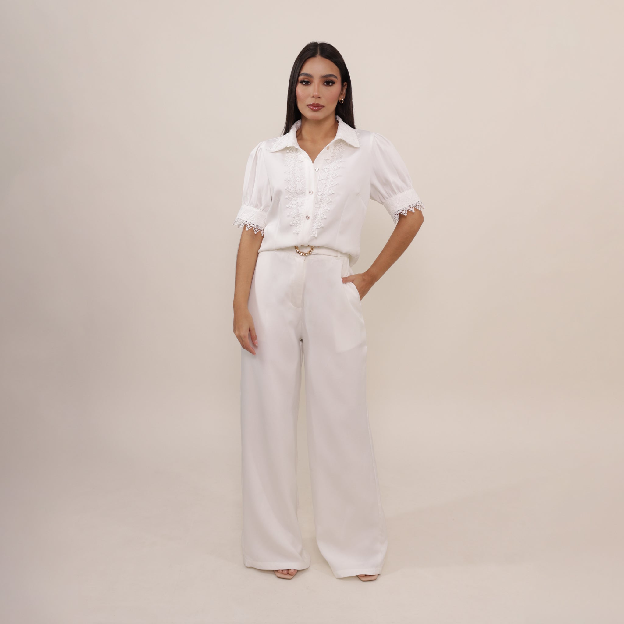 Conjunto blanco de dos piezas compuesto por blusa de manga corta con cuello camisero bordado y delicados detalles en encaje, acompañado de un pantalón de silueta recta con cinturón a tono y hebilla decorativa.