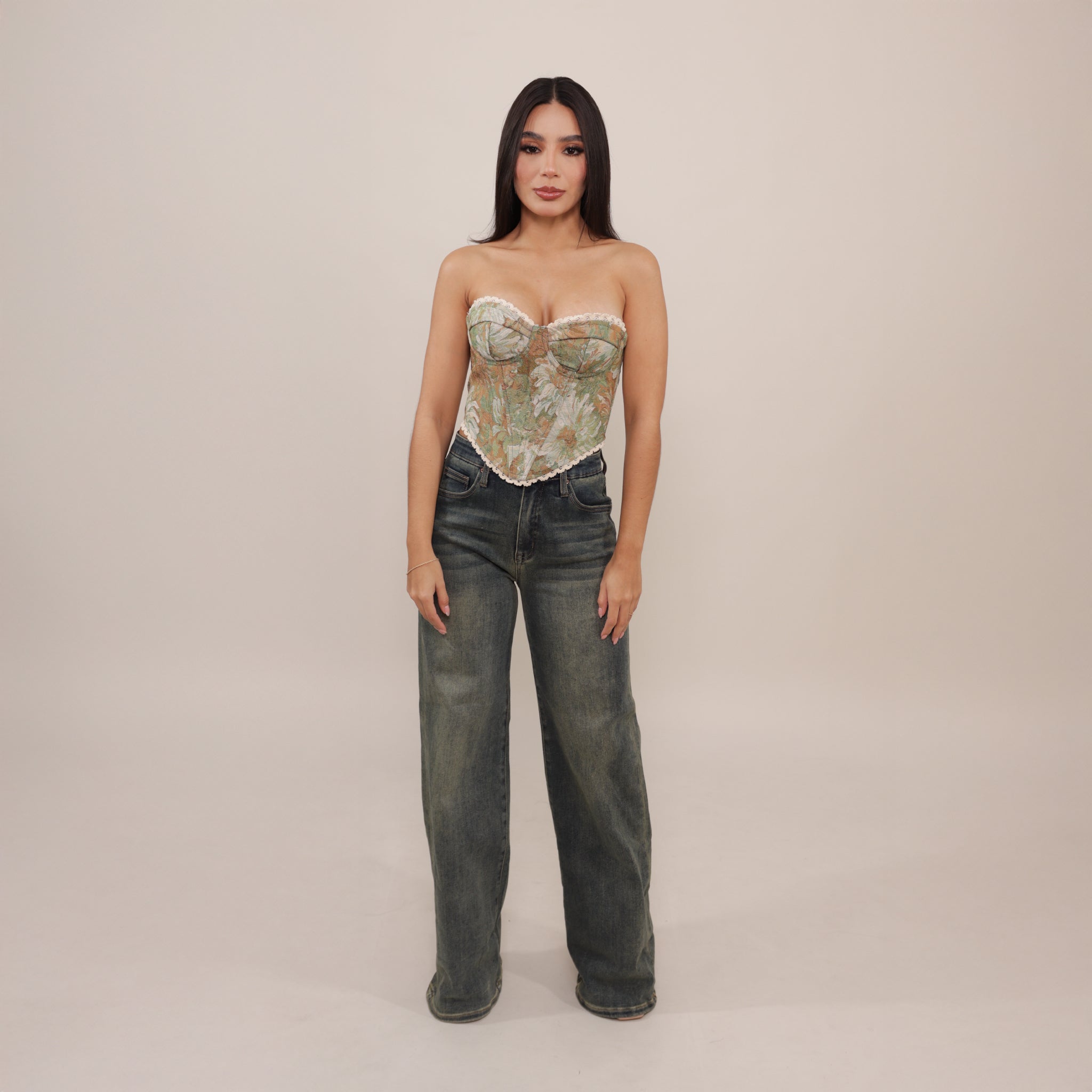 Un diseño romántico con aires sofisticados. Este corset presenta un estampado floral en tonos tierra y verdes, confeccionado en tela con textura tipo brocado que resalta su estilo elegante.