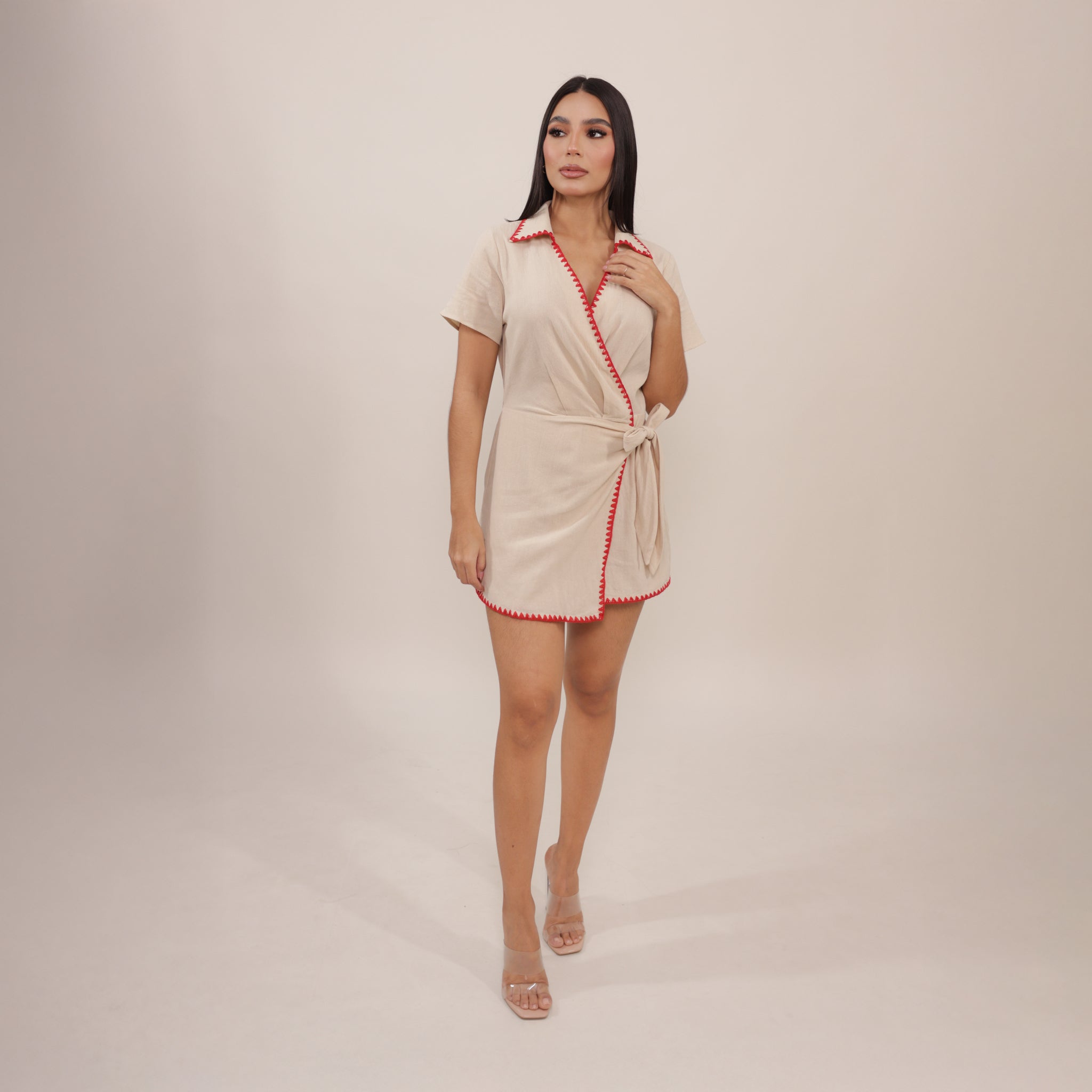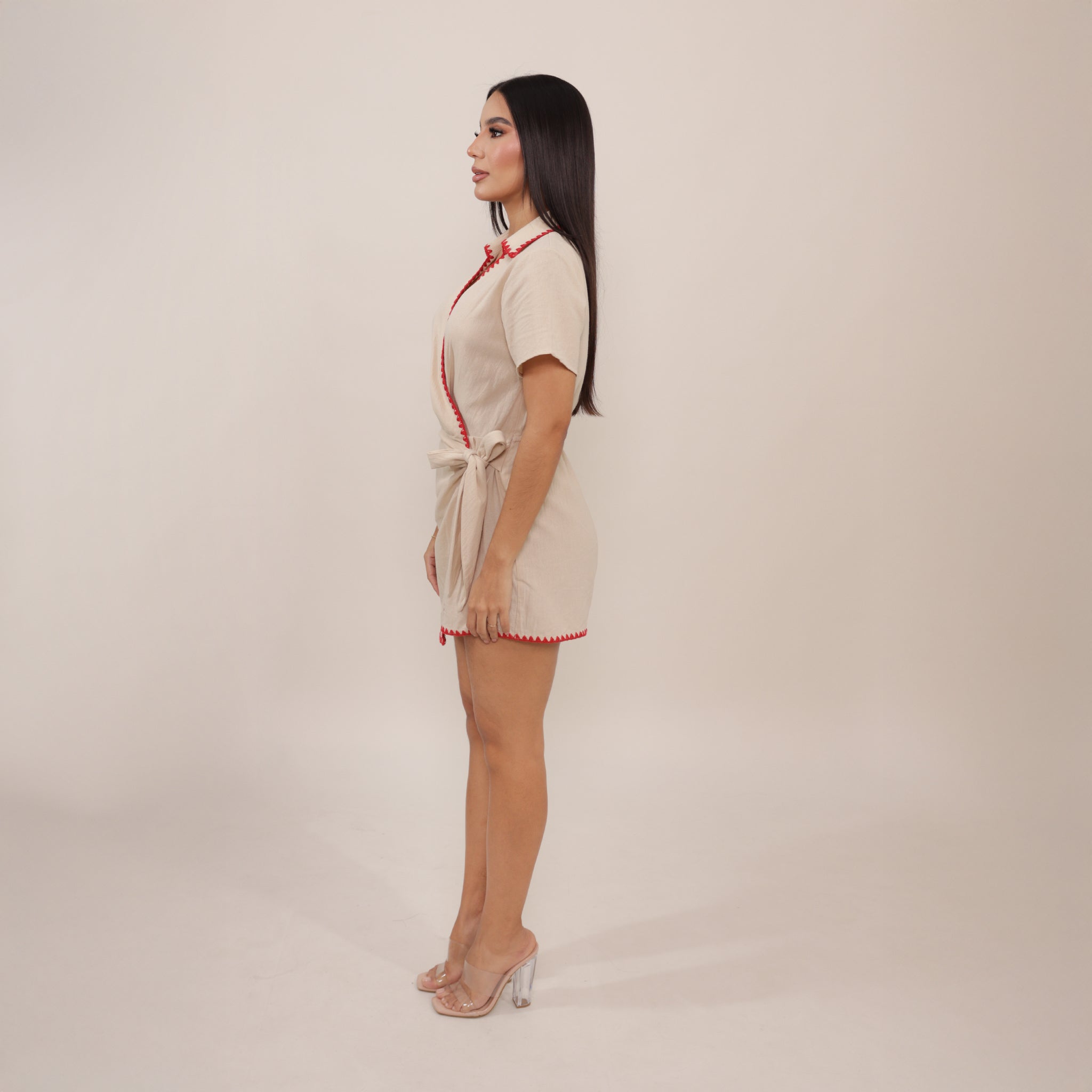 Enterizo corto con diseño cruzado al frente y amarre en la cintura que realza y estiliza la silueta. Sus bordes con ribete decorativo aportan un contraste moderno y vibrante, destacando el cuello camisero y el dobladillo. De mangas cortas y estilo ligero, es la prenda ideal para días cálidos y ocasiones casuales con un aire fresco y sofisticado.