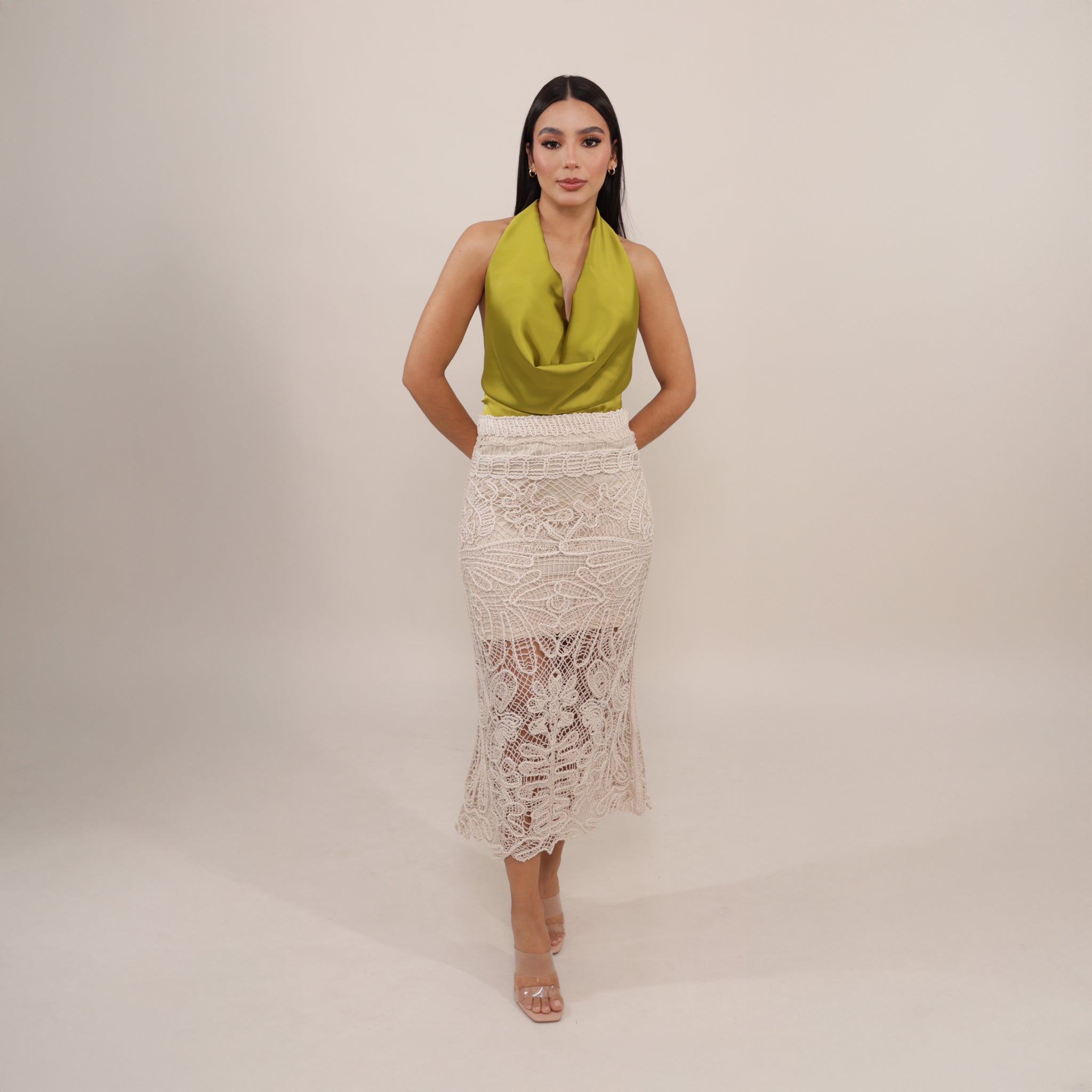 Esta falda midi está confeccionada en delicado encaje guipiur que combina una transparencia sutil con un diseño lleno de elegancia. Su silueta estilizada resalta la feminidad, mientras que sus detalles aportan un toque único y sofisticado. Perfecta para ocasiones especiales o para elevar un look casual con estilo exclusivo.