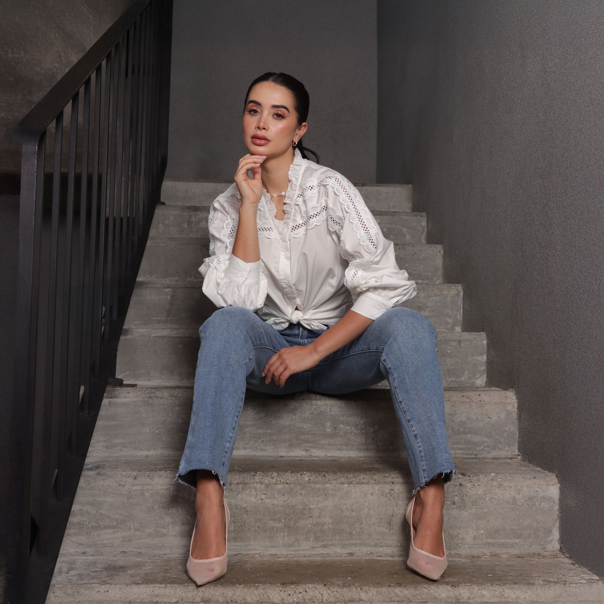 Jean azul de corte recto con tiro alto y terminación desgastada. Confeccionado en denim suave con ligero stretch para un ajuste cómodo y favorecedor.