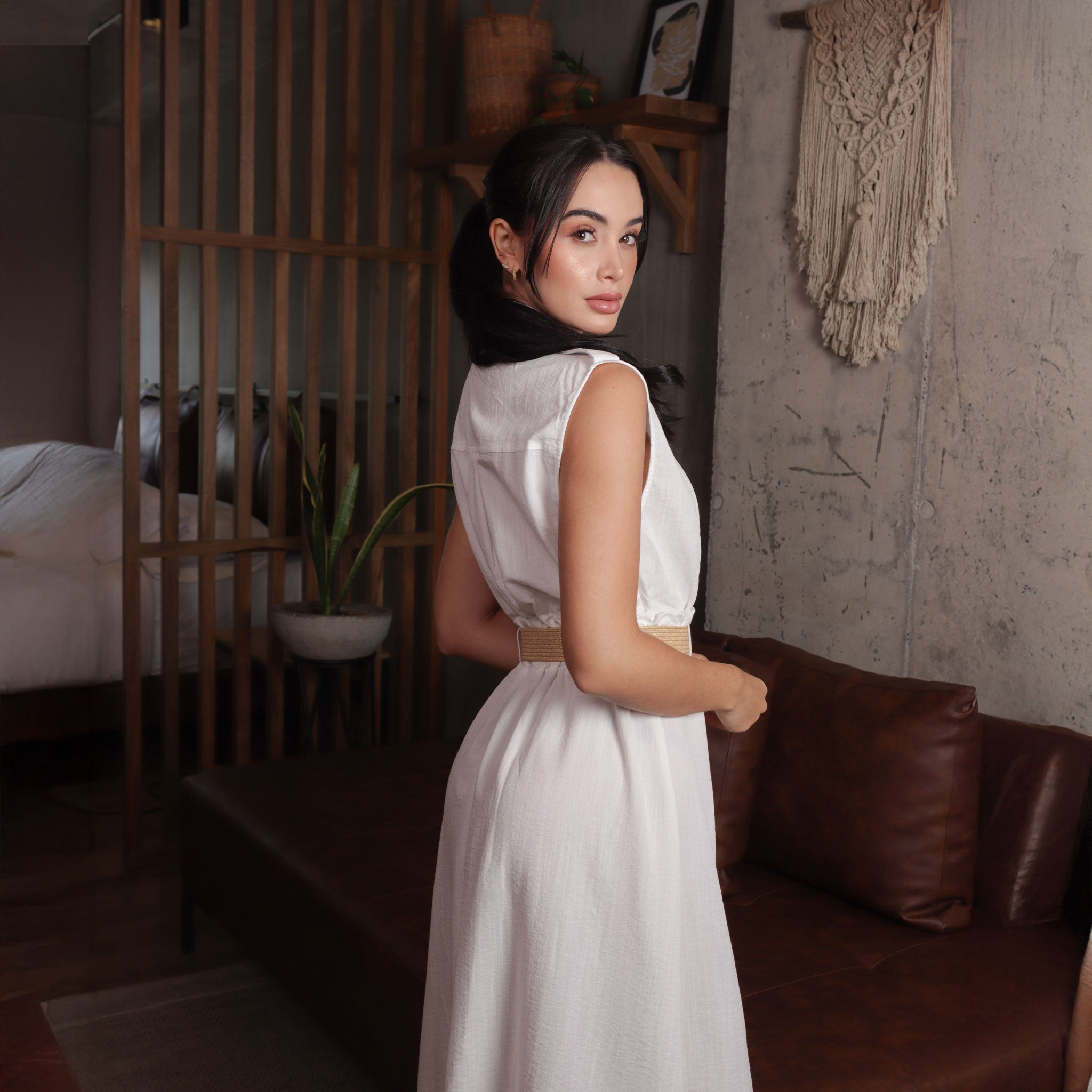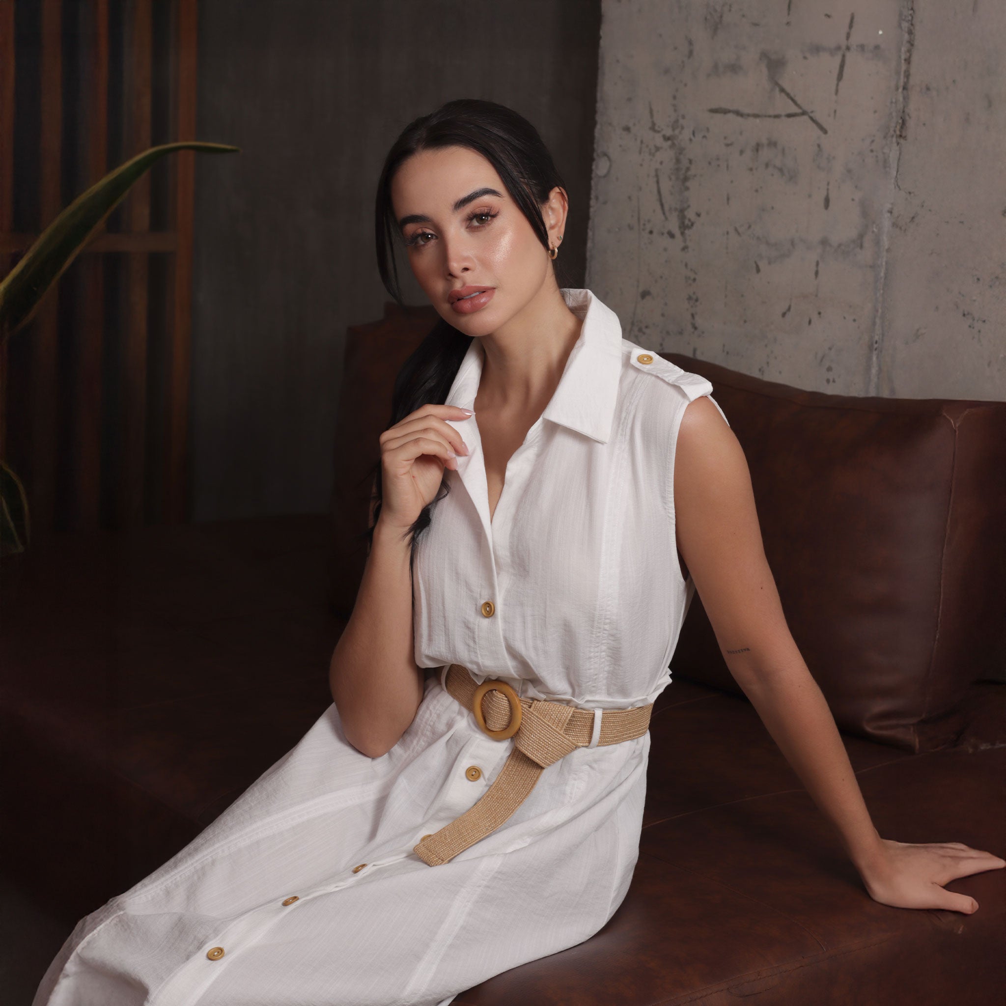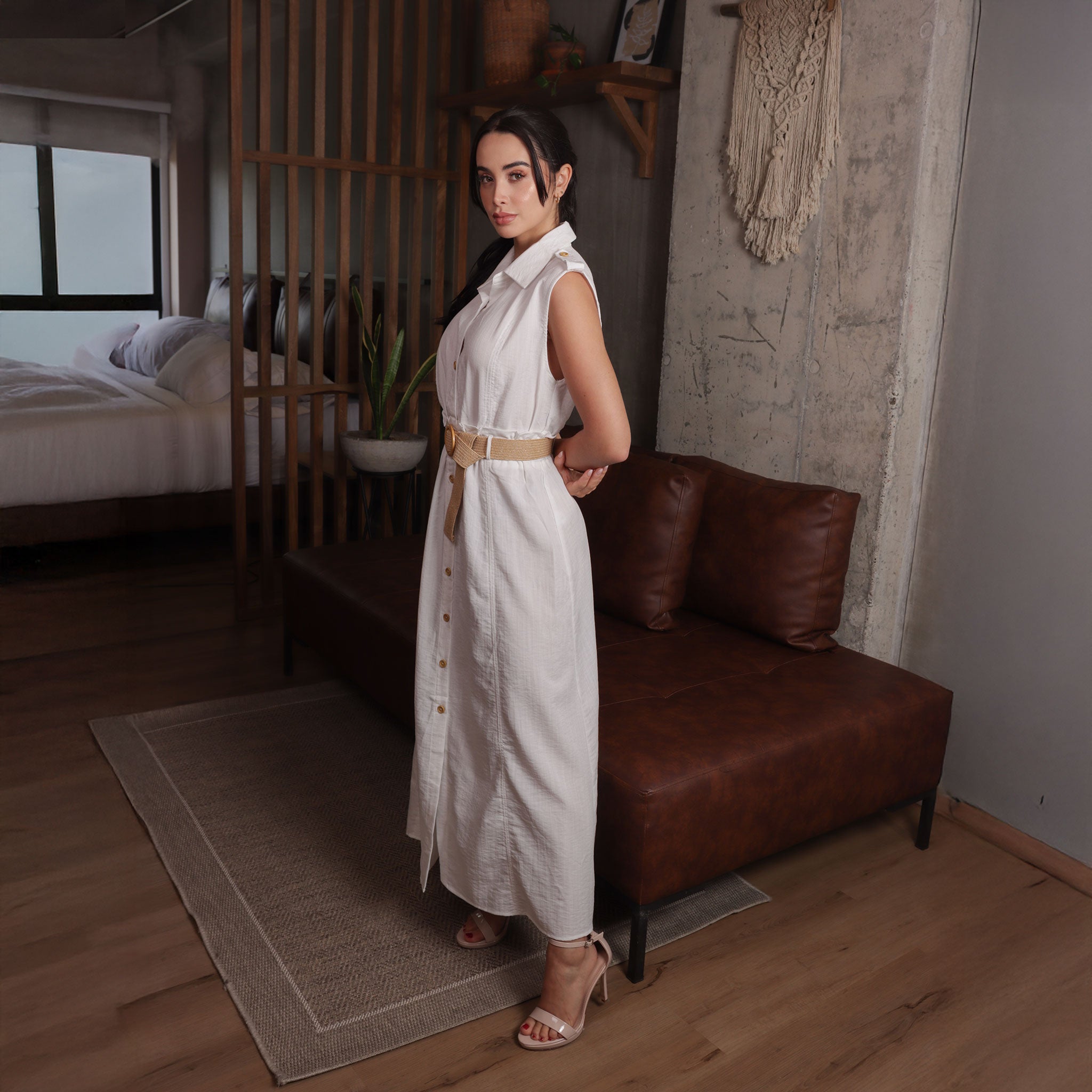 Vestido largo sin mangas, confeccionado en tela ligera de textura suave. Diseño con cuello camisero, botones frontales y cinturón trenzado con hebilla redonda que realza la cintura.