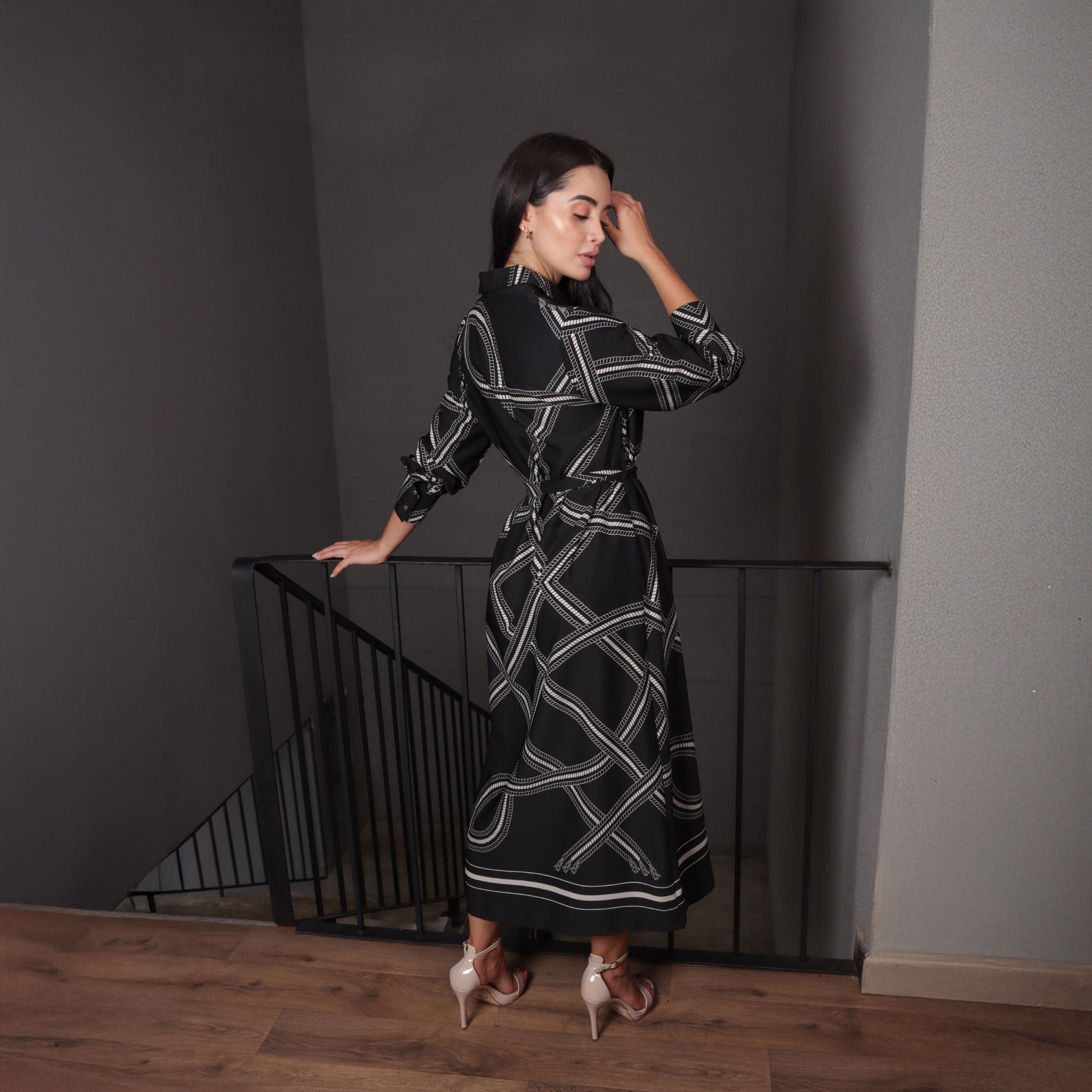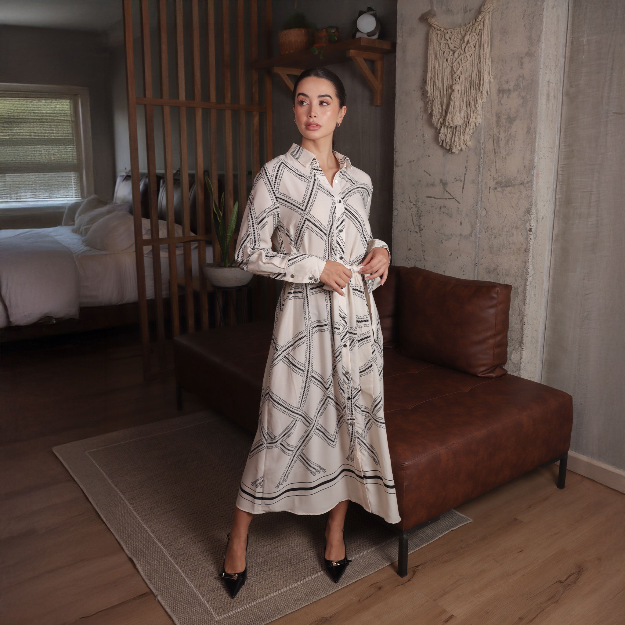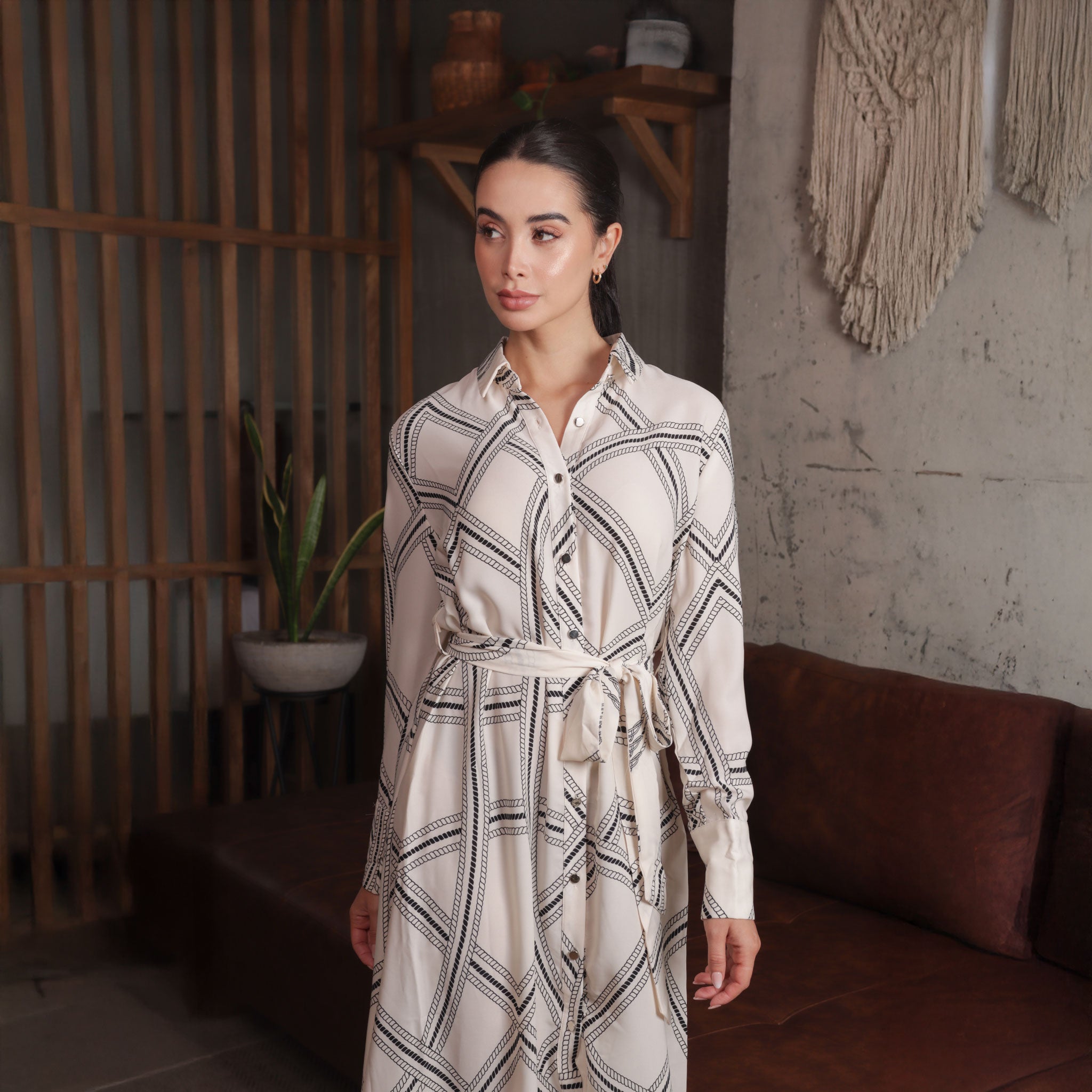 Vestido camisero de silueta amplia con botones frontales y cinturón ajustable que realza la figura. Con un estampado geométrico elegante y tejido de caída ligera, combina comodidad y estilo.