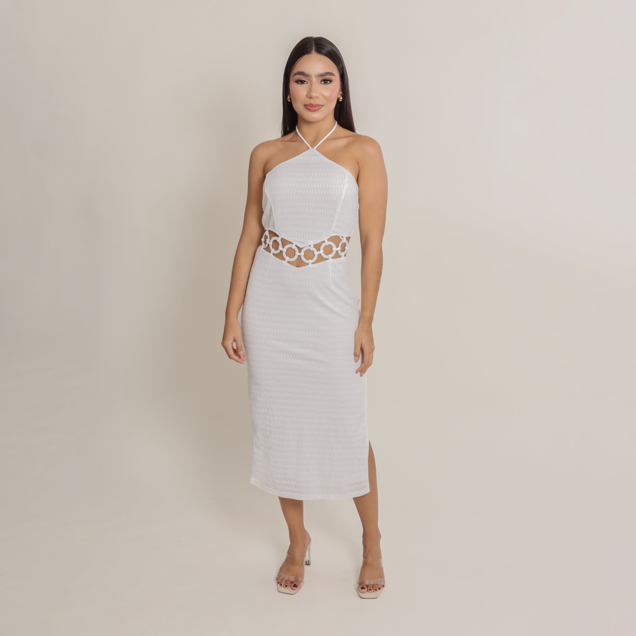 Confeccionado en un tejido blanco de textura delicada, su silueta ajustada realza la figura, mientras el largo midi y la abertura lateral añaden un toque de elegancia.