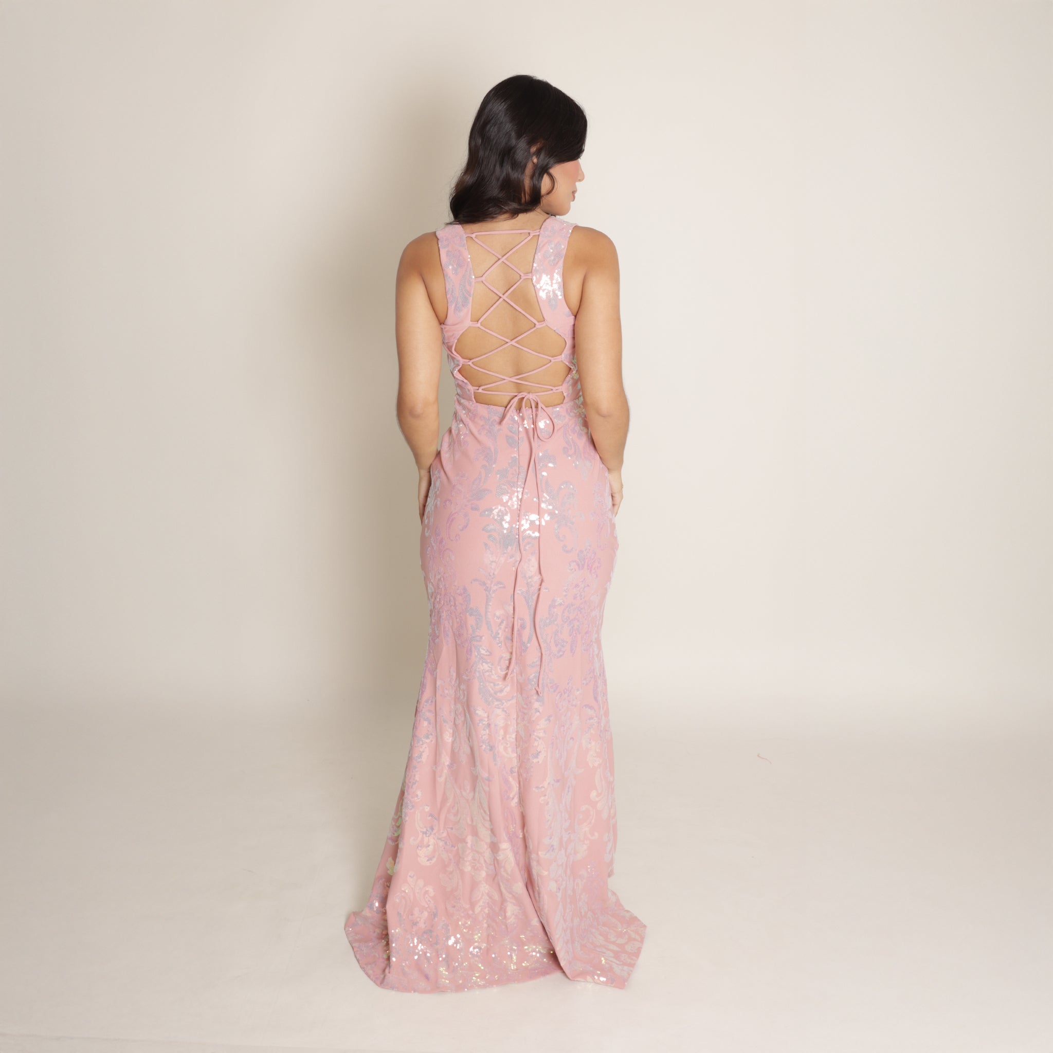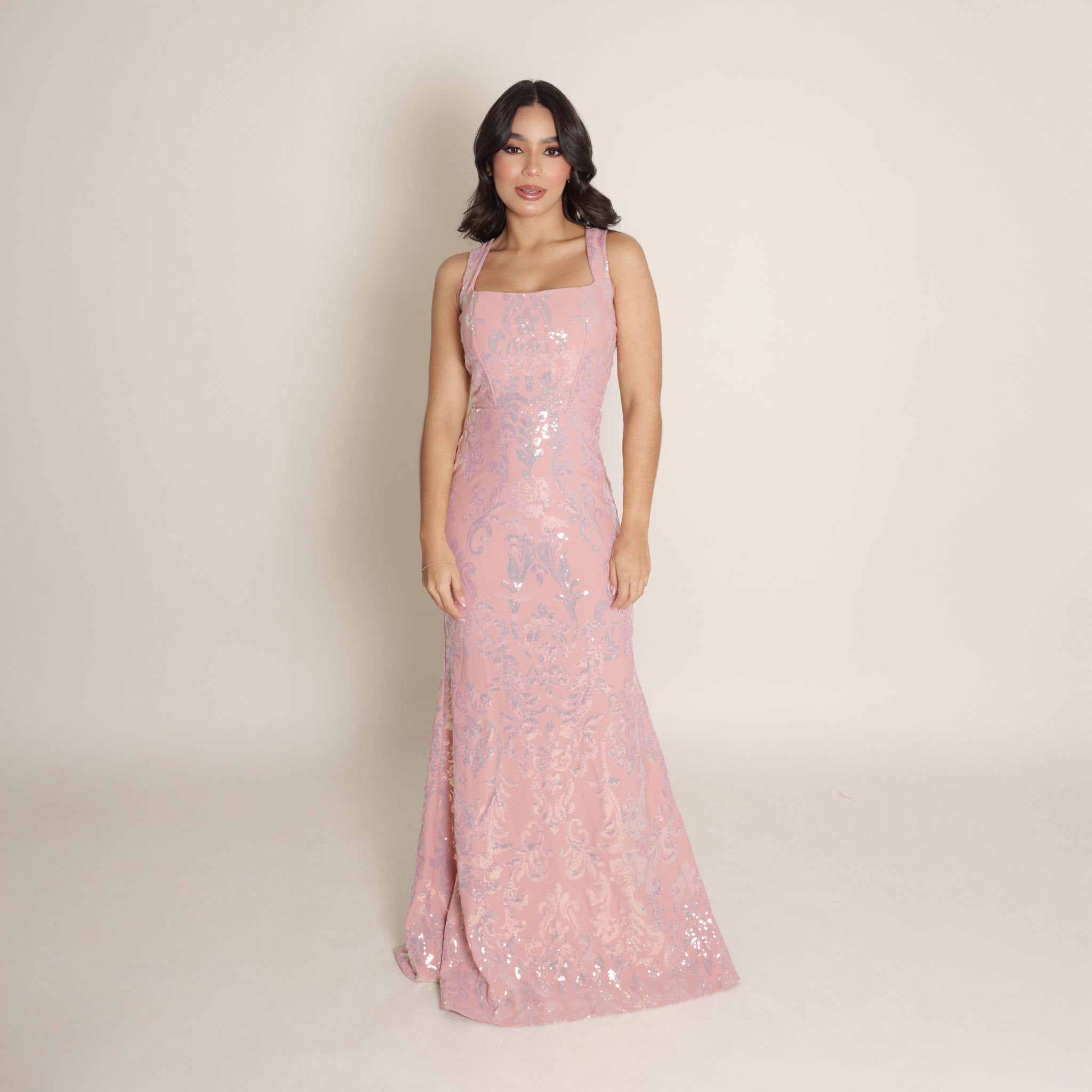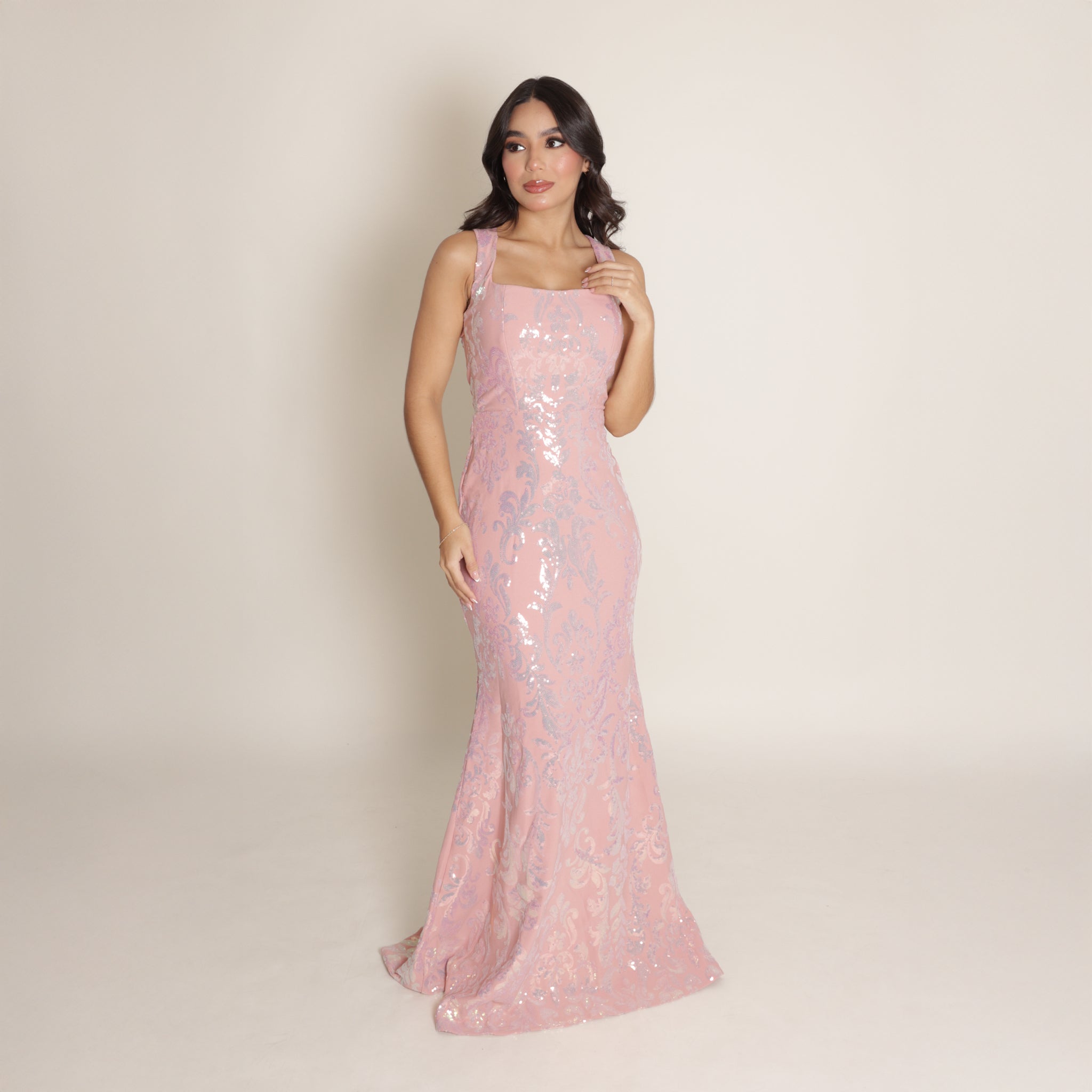 Vestido largo de fiesta en tono palo de rosa con escote recto y tirantes anchos que aportan un aire sofisticado. Confeccionado en tela con aplicaciones de lentejuelas en diseños florales y arabescos, ofrece un brillo elegante y delicado. Su silueta ajustada en la parte superior estiliza la figura, mientras que la falda con caída ligera añade movimiento y distinción. Una opción ideal para eventos de noche y ocasiones especiales.