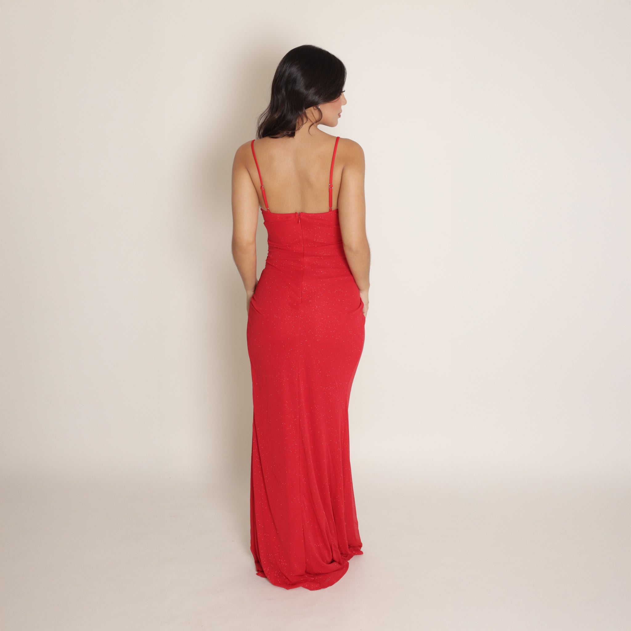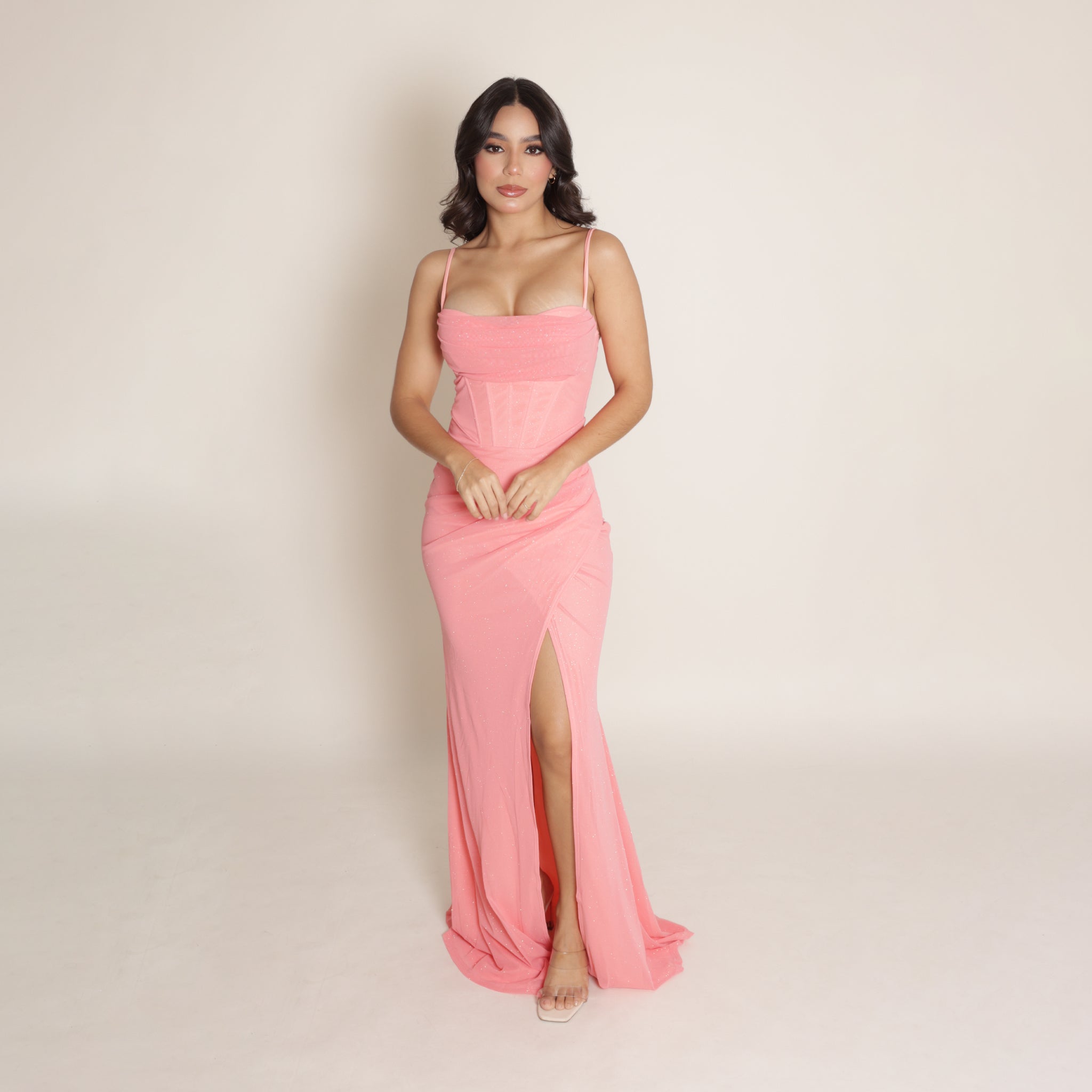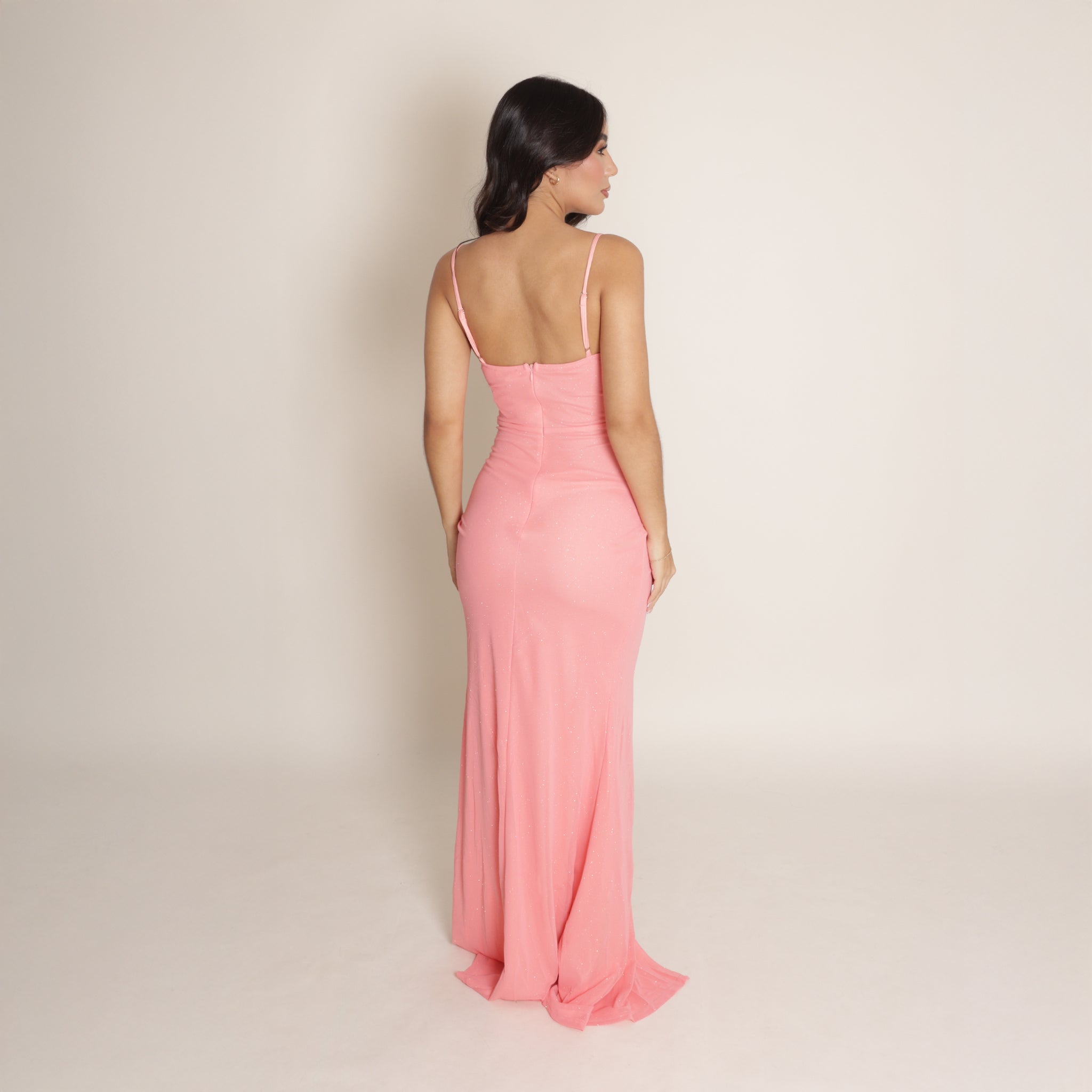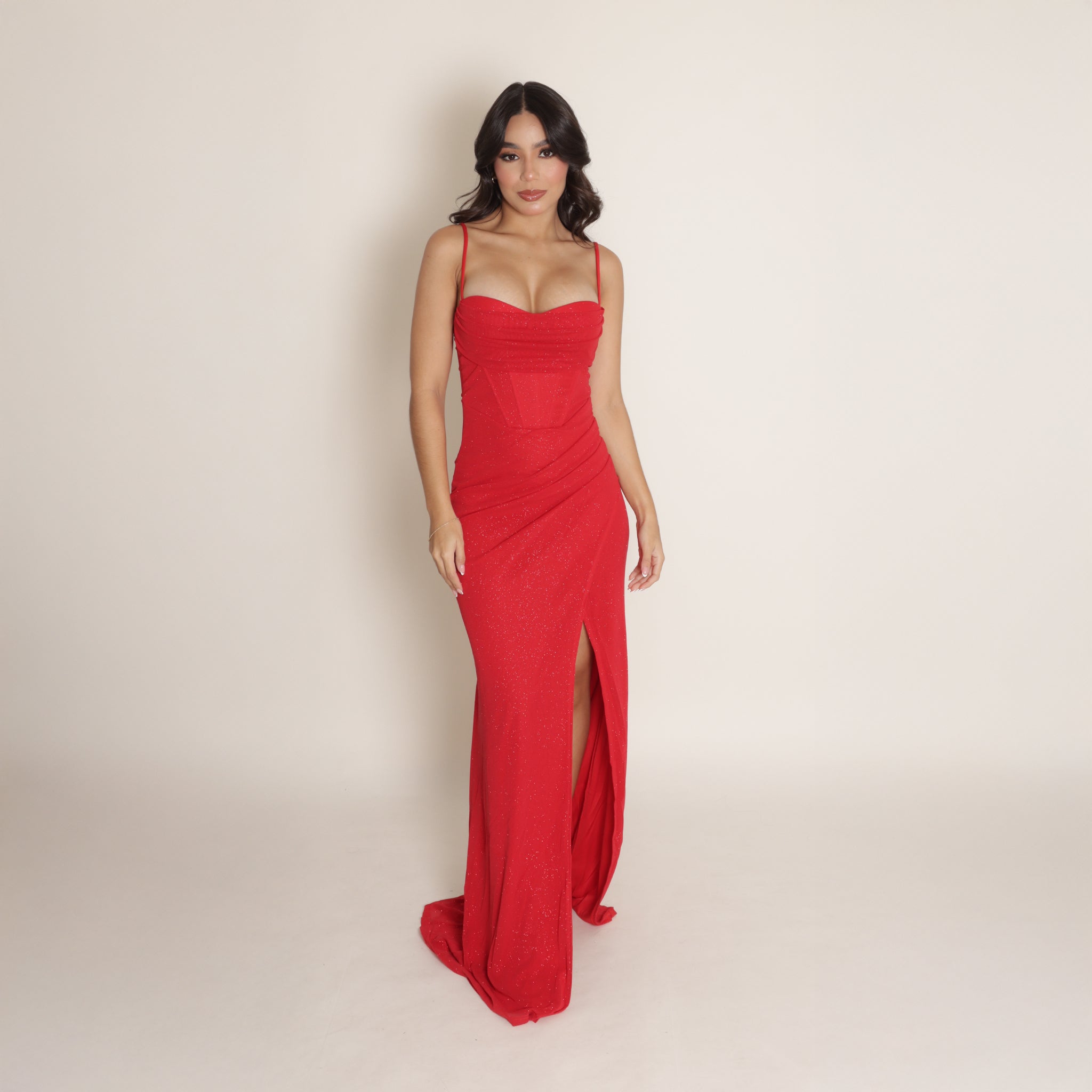Vestido largo de fiesta con tirantes finos y escote en forma corazón que realza el busto con elegancia. Confeccionado en tela con sutil brillo, presenta una silueta ajustada que estiliza la figura. El diseño incorpora un delicado drapeado en la cintura y una abertura lateral que aporta un toque sensual y sofisticado. Ideal para ocasiones especiales y eventos de noche.