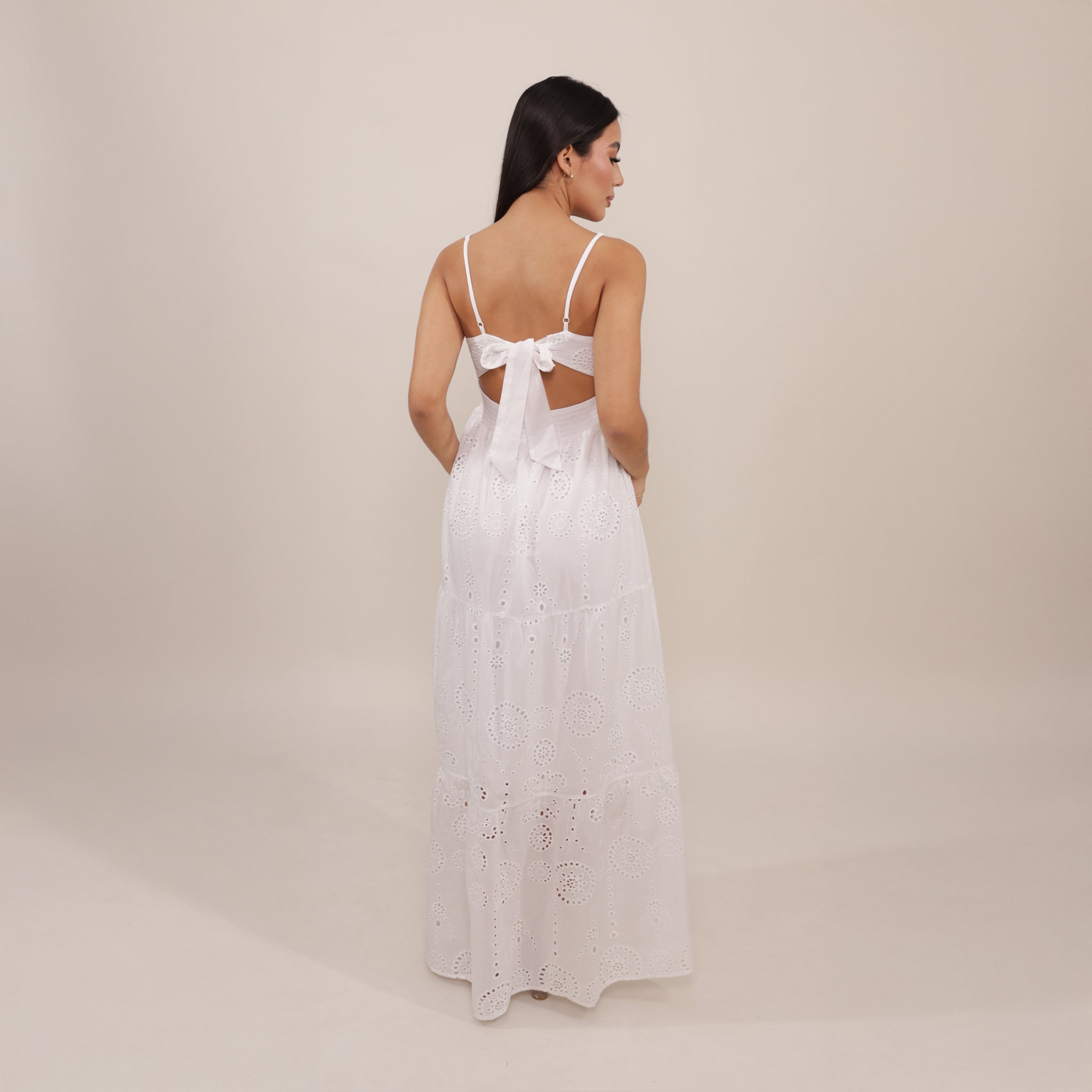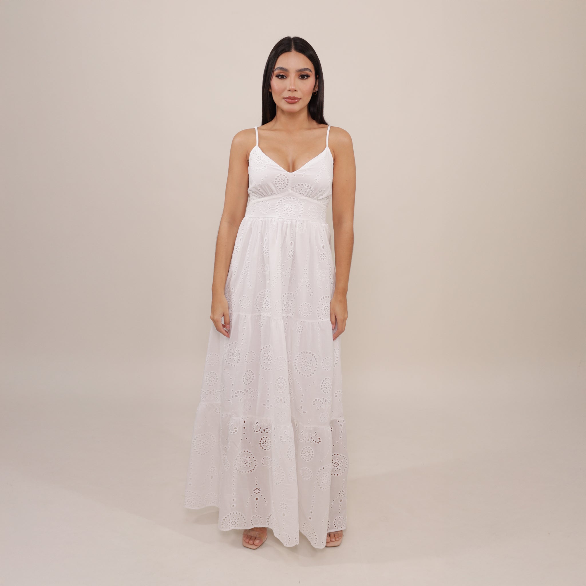 Vestido blanco maxi en tela de ojalillo de algodón ligero que aporta un aire romántico y fresco. Presenta tirantes finos, escote en V con corte en el busto y cintura ajustada que estiliza la silueta.