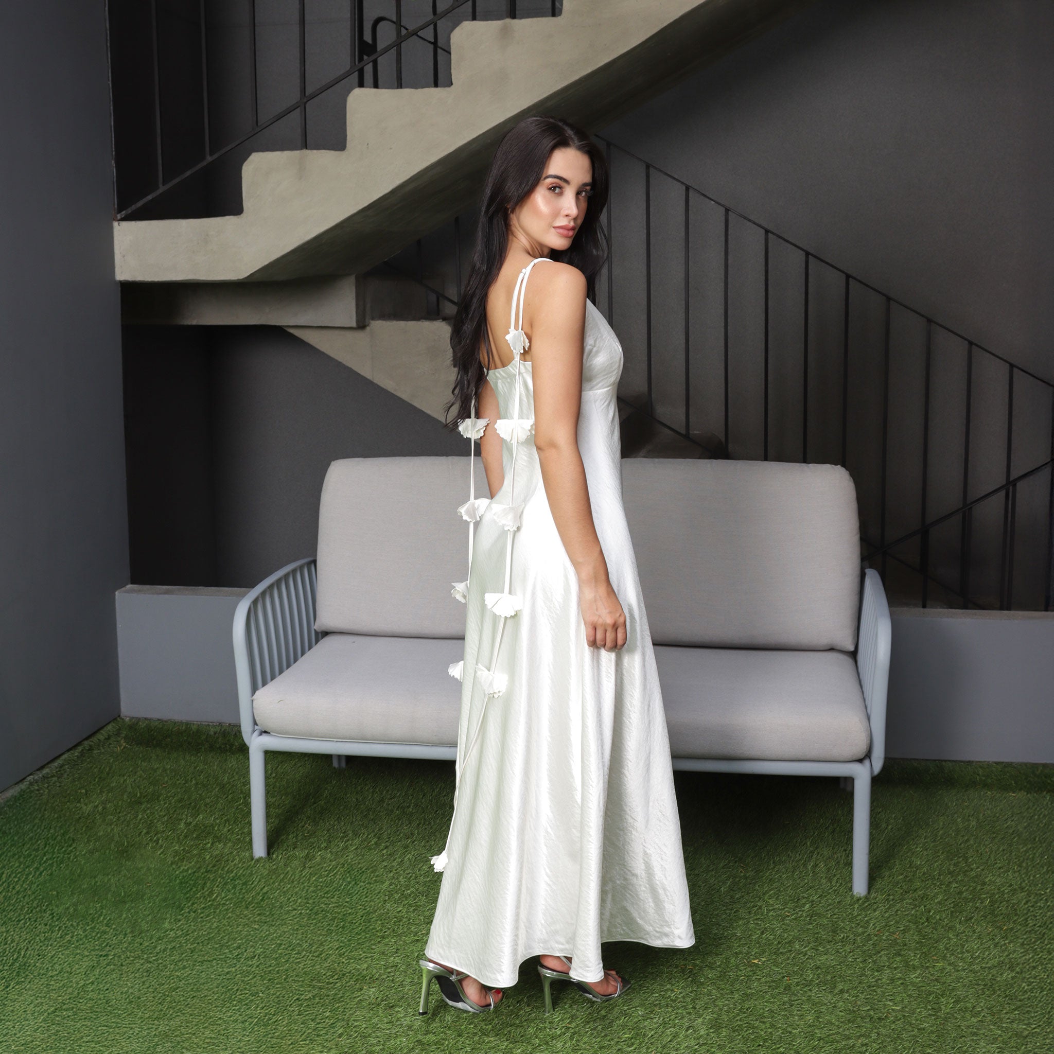 Vestido largo en satín color champagne con tiras delgadas y escote en V. De silueta fluida y caída elegante.