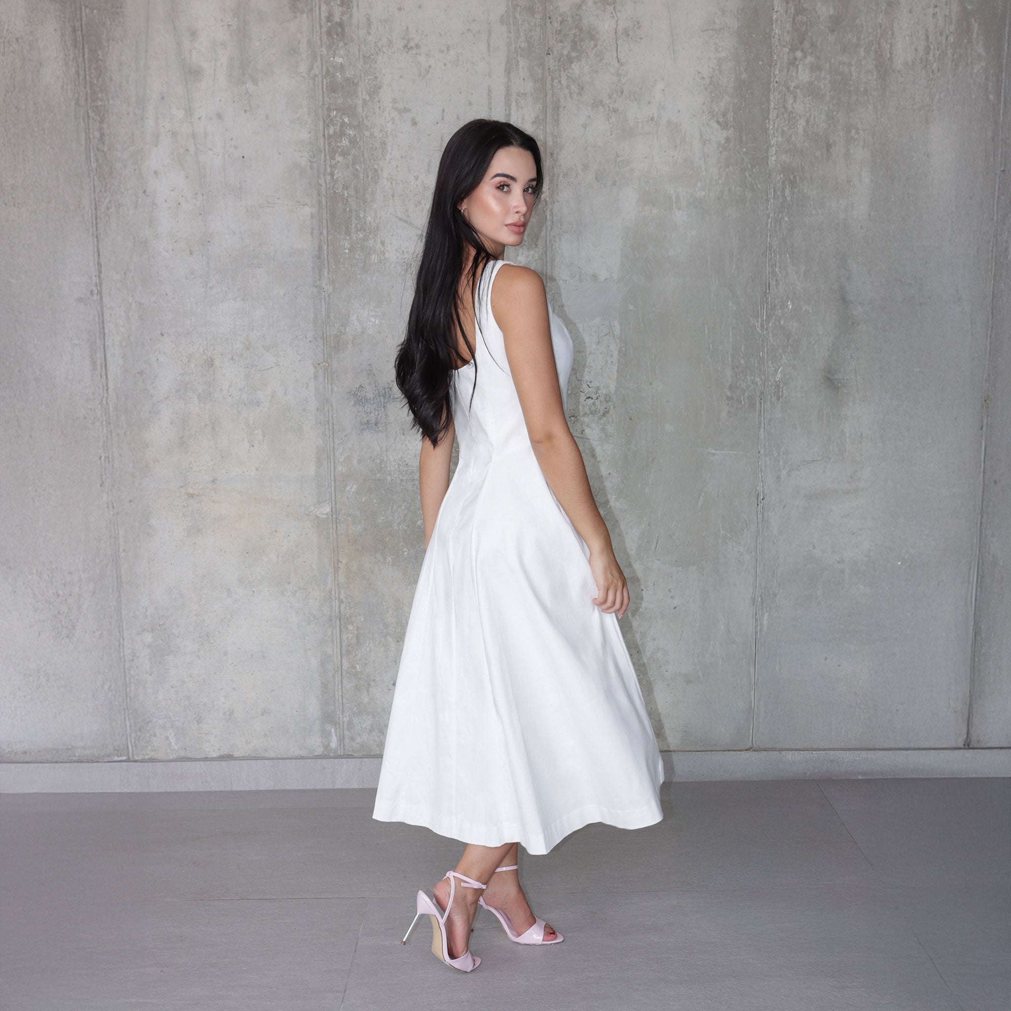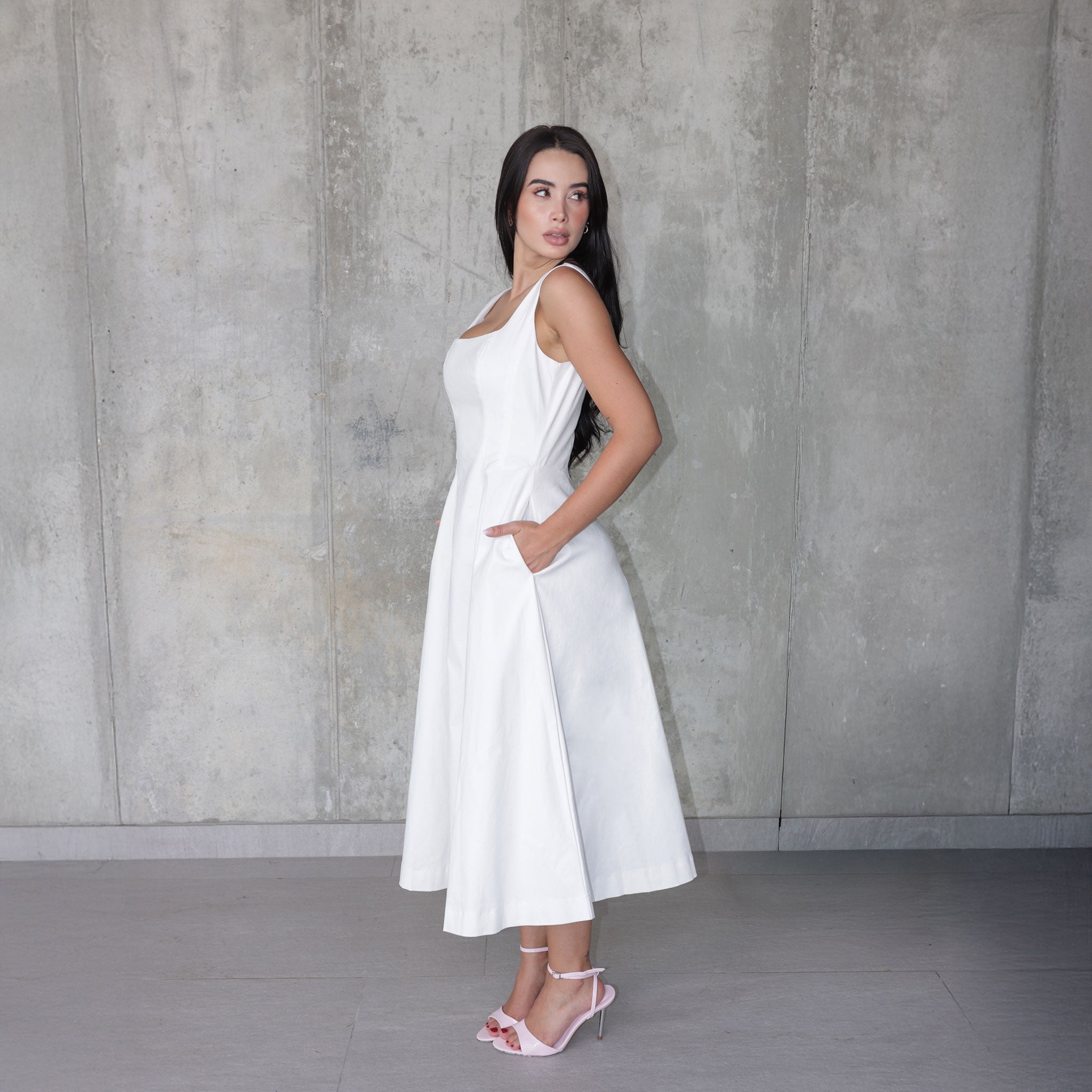 Vestido midi de silueta estructurada con escote cuadrado y tiras anchas. Confeccionado en una tela firme de caída elegante, resalta la figura con un corte entallado en la cintura y falda amplia con movimiento. Incluye prácticos bolsillos laterales que aportan un toque funcional sin perder la sofisticación.