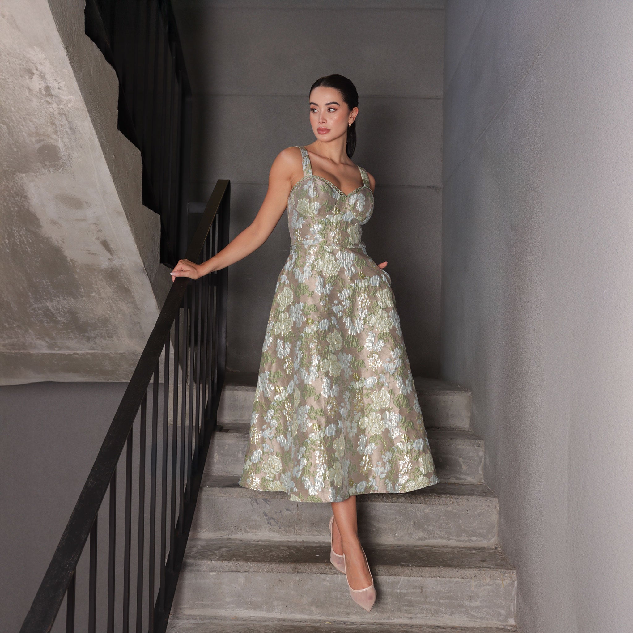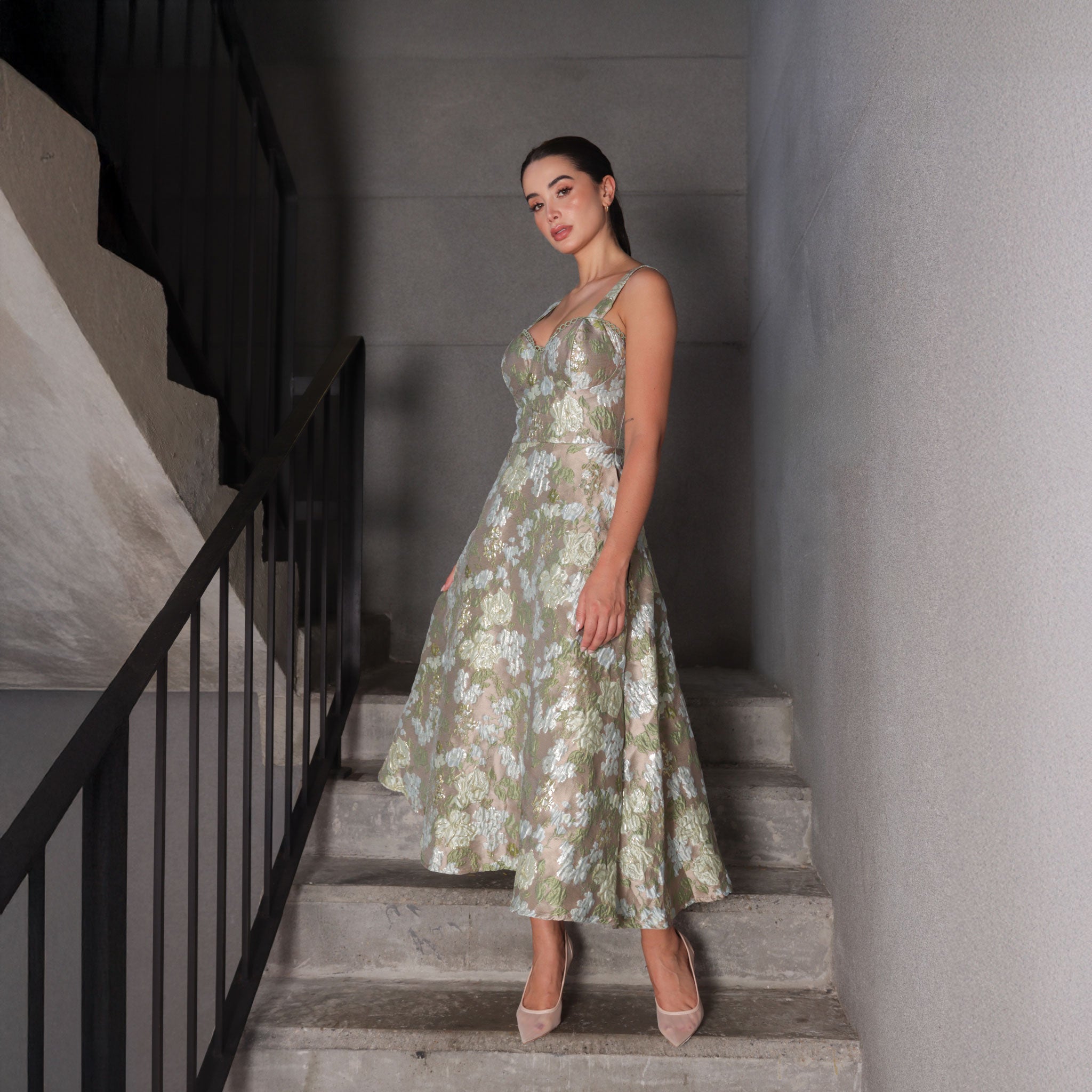 Vestido midi con diseño estructurado y escote tipo corsé que realza la figura. Su tejido con relieve floral y sutil brillo crea una apariencia elegante y romántica