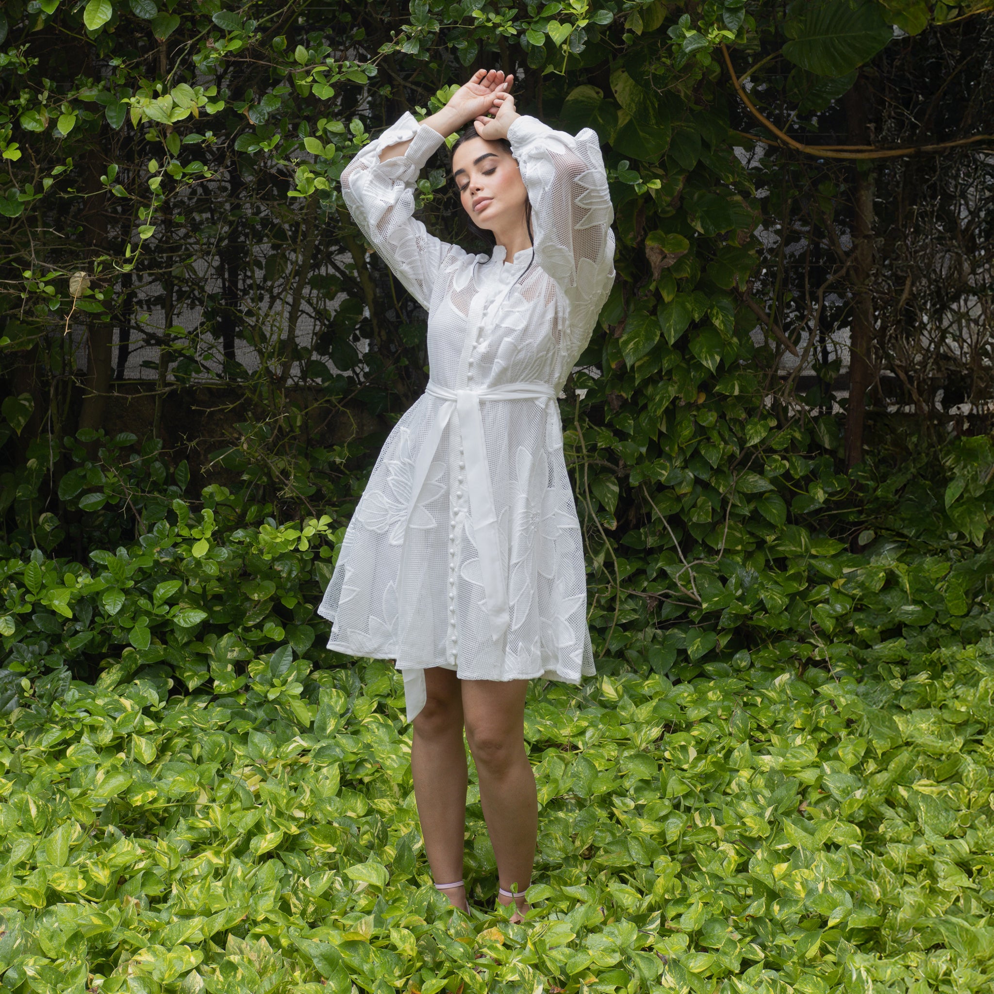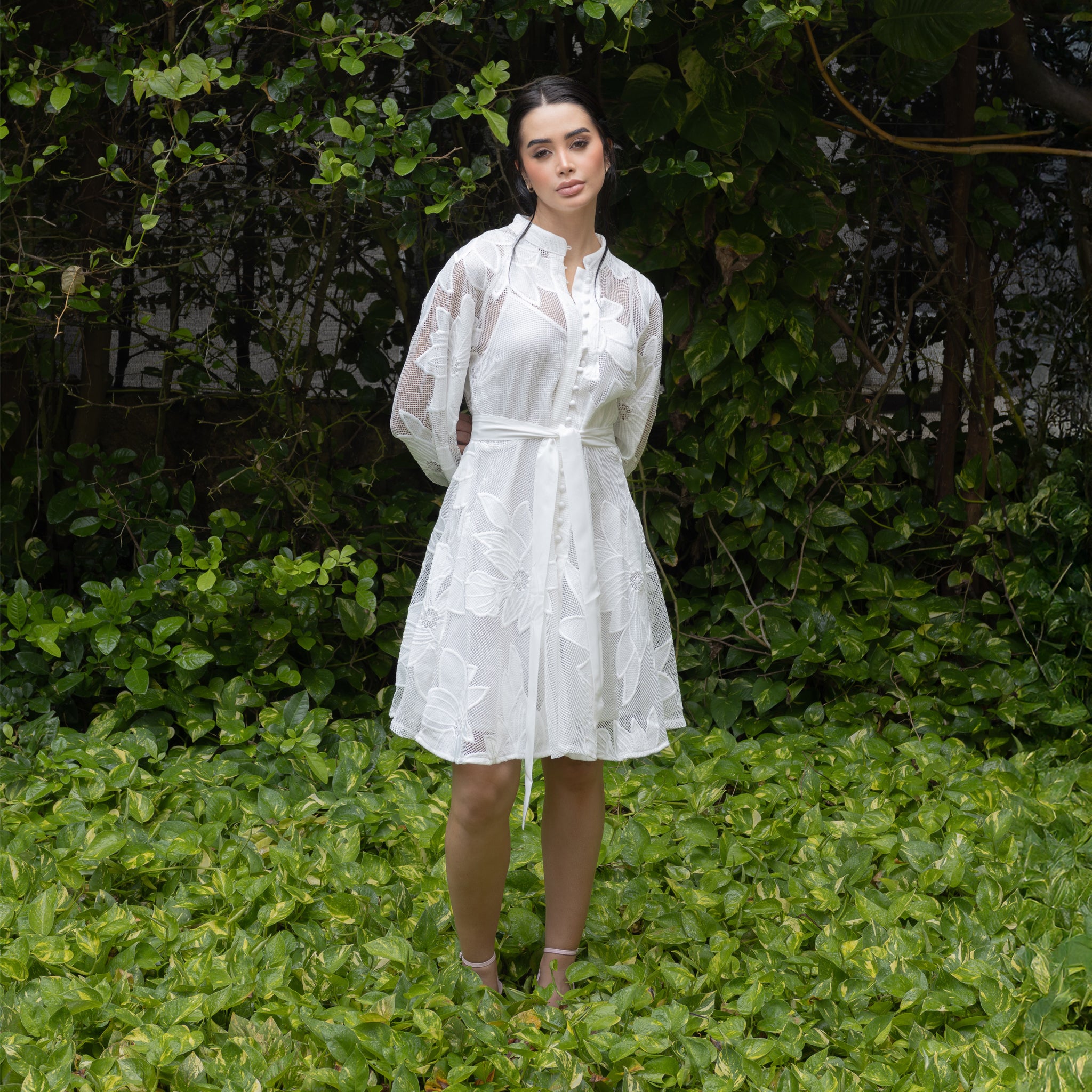 Este vestido ivory de manga larga destaca por su elegancia sutil y detalles románticos. Confeccionado en tela ligera con bordados florales en relieve, combina un diseño camisero con botonadura frontal y cuello alto que aporta sofisticación. Incluye un cinturón del mismo material para definir la cintura y realzar la silueta.