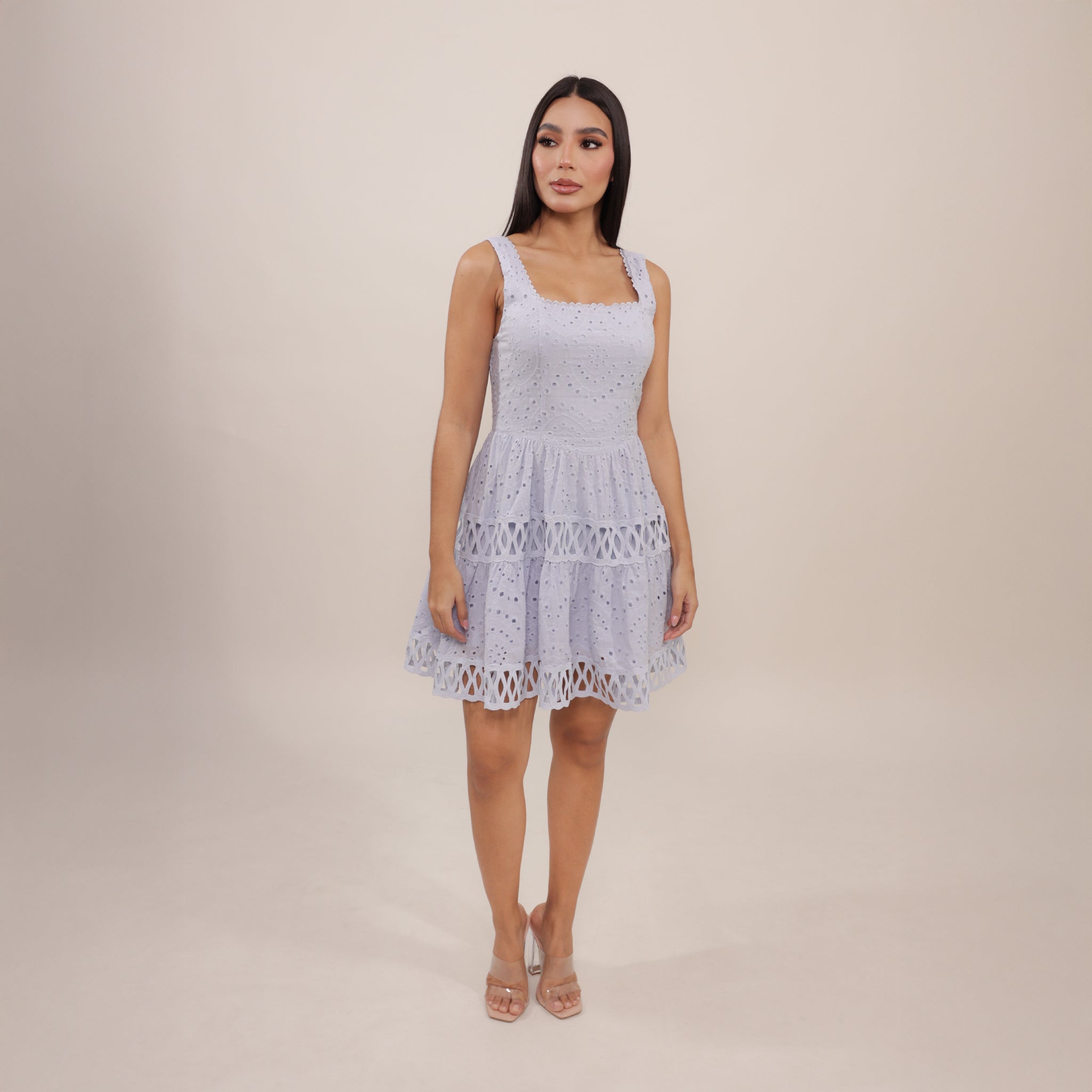 Este vestido corto en tono azul, confeccionado en tela de ojalillo, es una propuesta romántica y fresca. Su diseño con caída en capas aporta movimiento y realza la feminidad.
