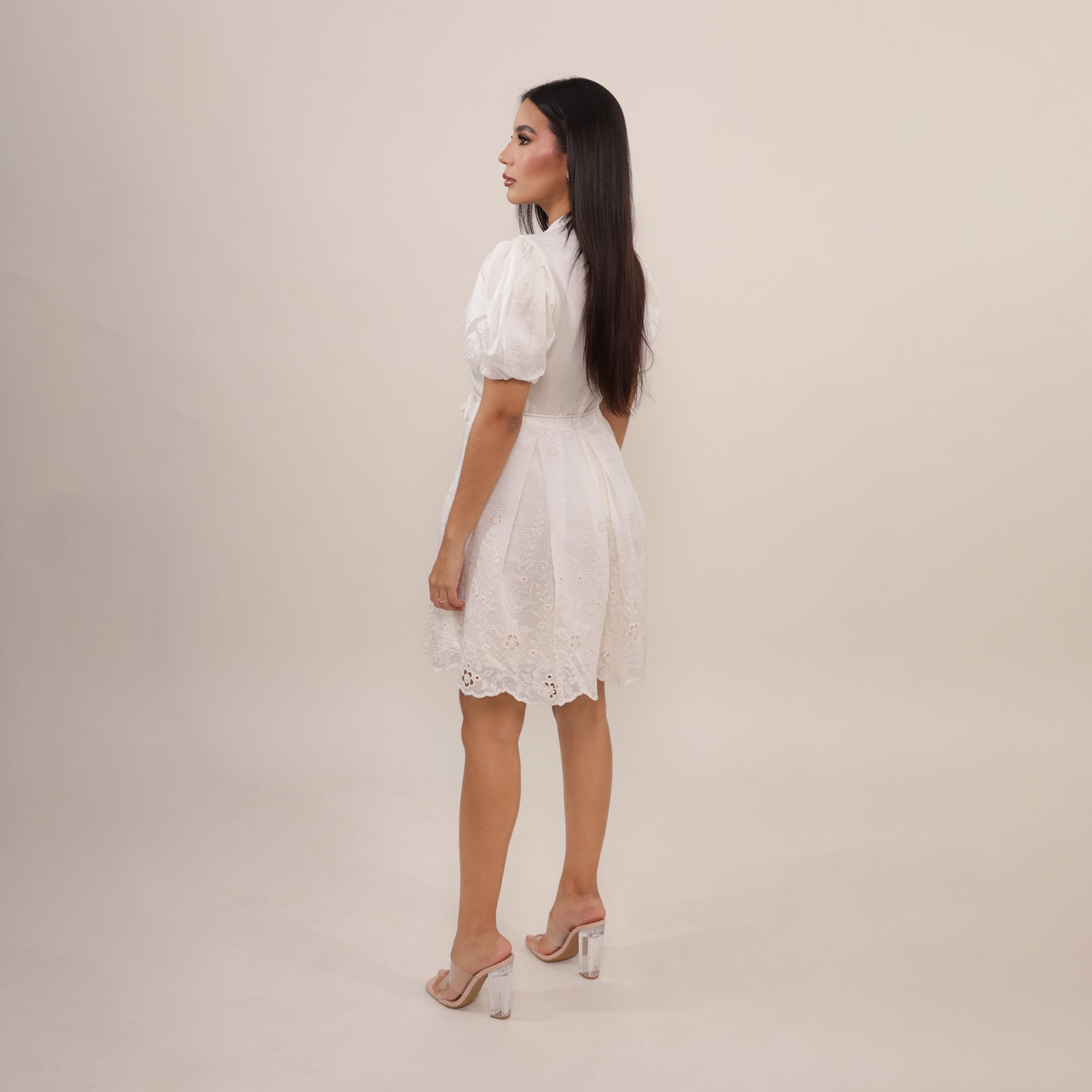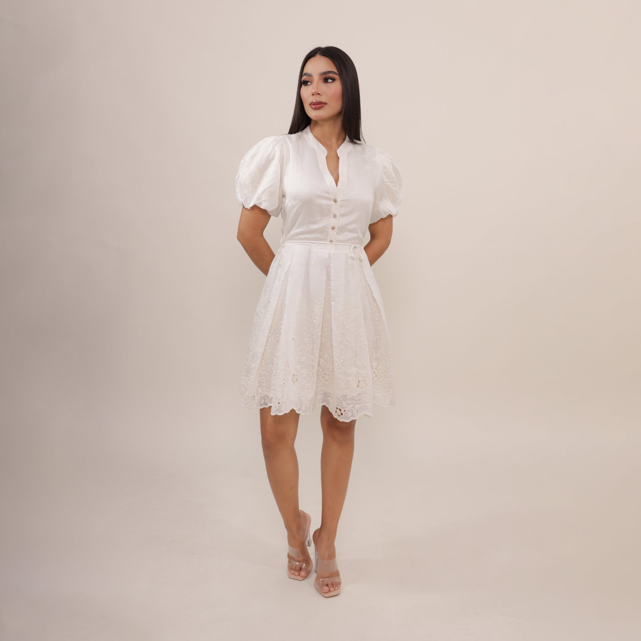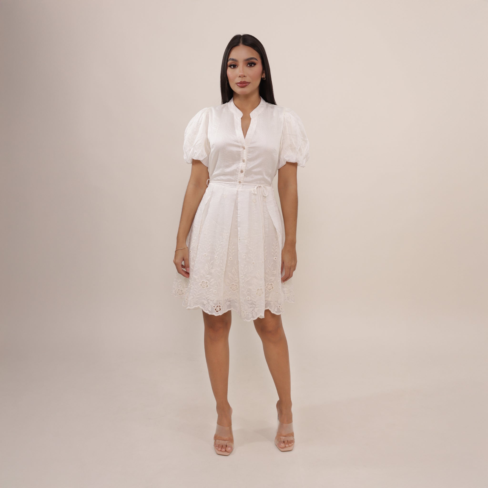 Vestido corto en tono crema con delicados detalles en encaje en el ruedo. Presenta mangas abullonadas, escote en V con botones frontales y cinturón ajustable que define la cintura. Una prenda femenina y elegante, ideal para ocasiones especiales.