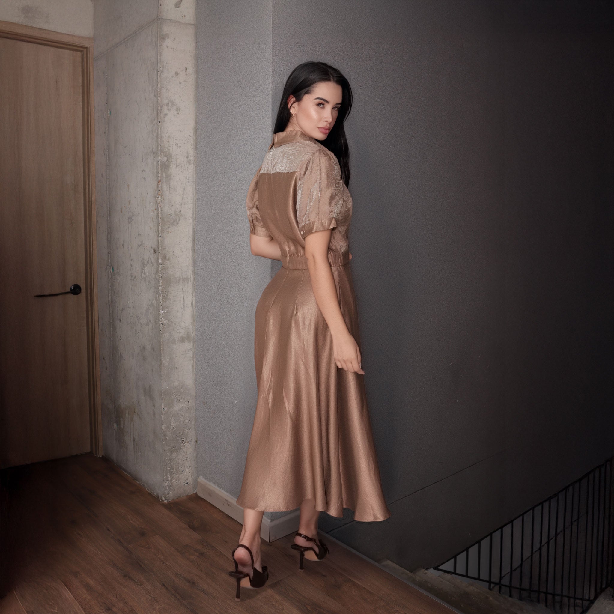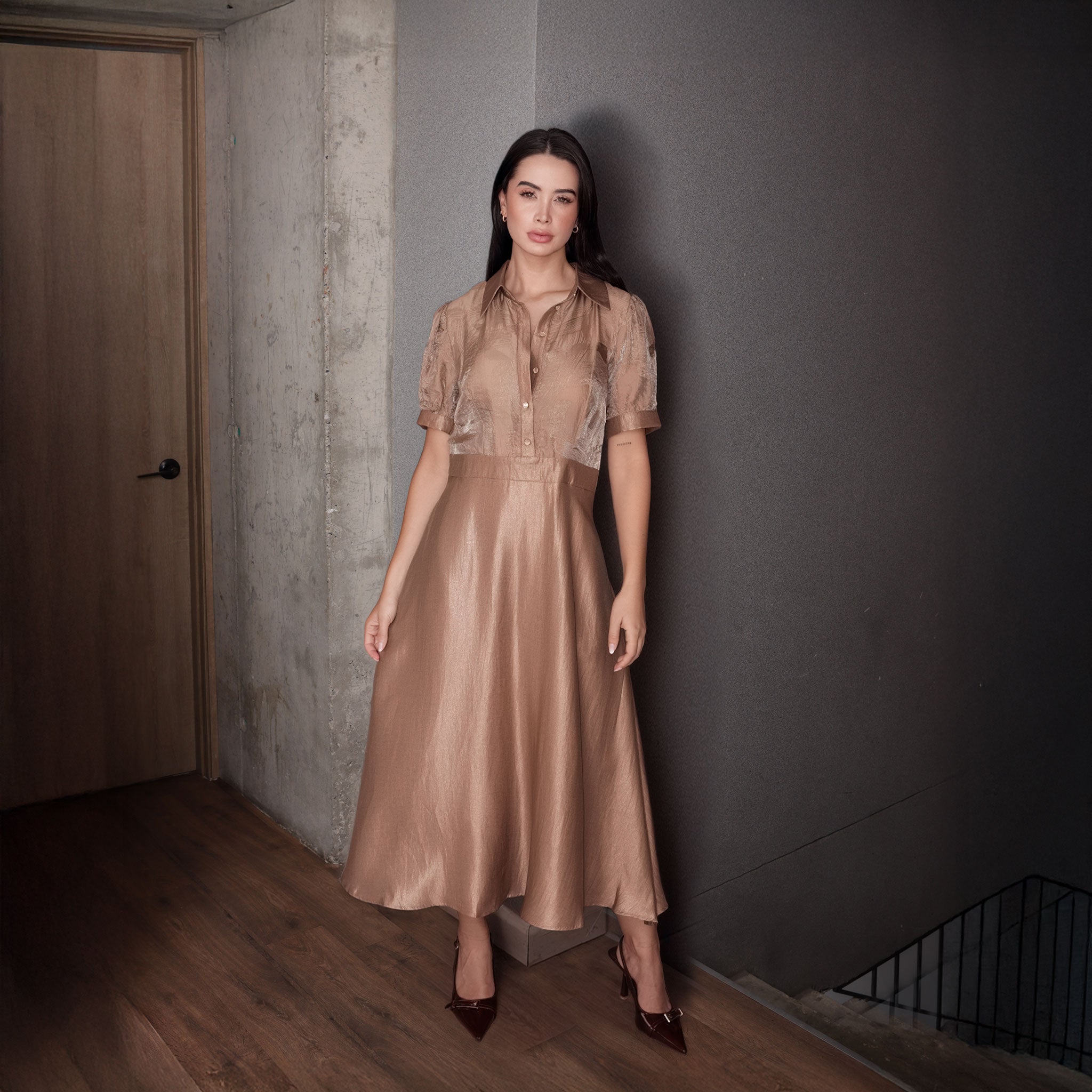 Vestido midi en satín con acabado brillante y silueta evasé. Presenta cuello camisero, botones frontales y mangas cortas con detalle transparente que aportan un aire delicado y sofisticado.