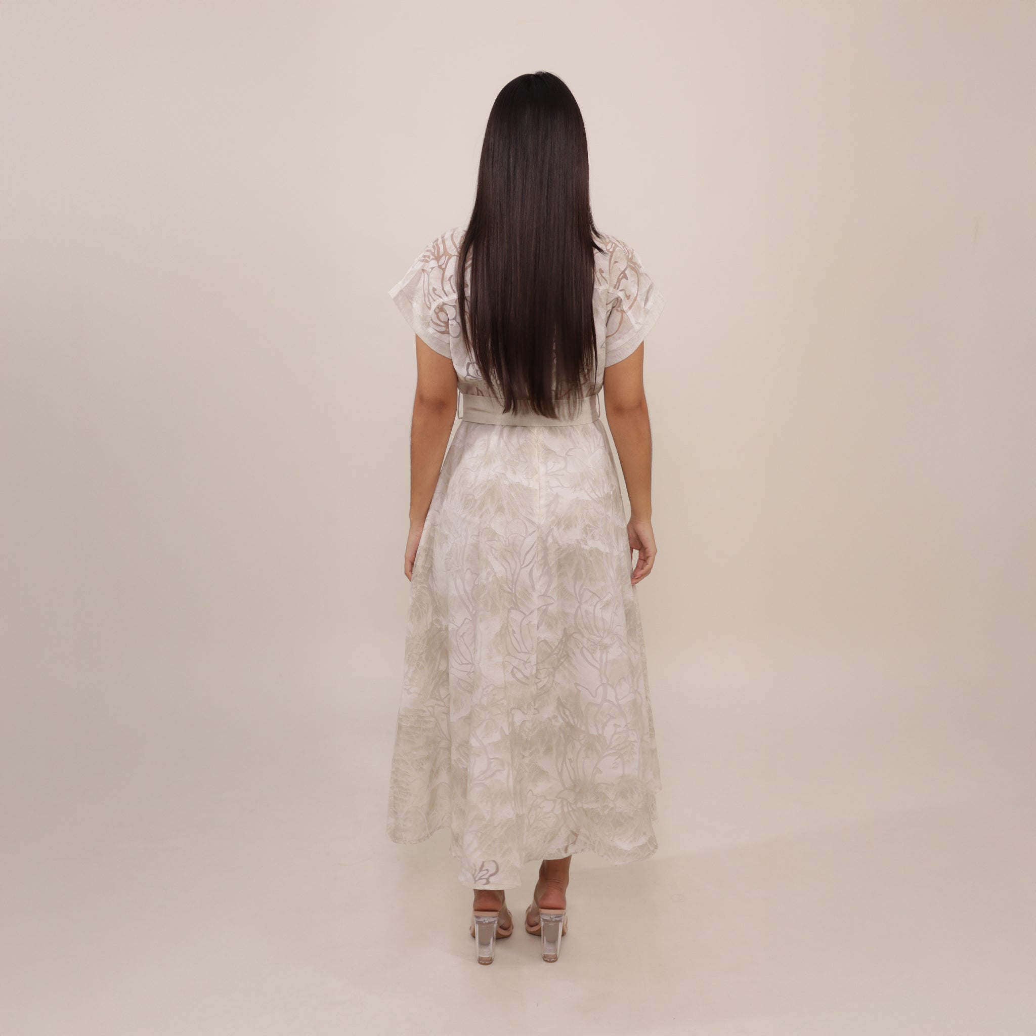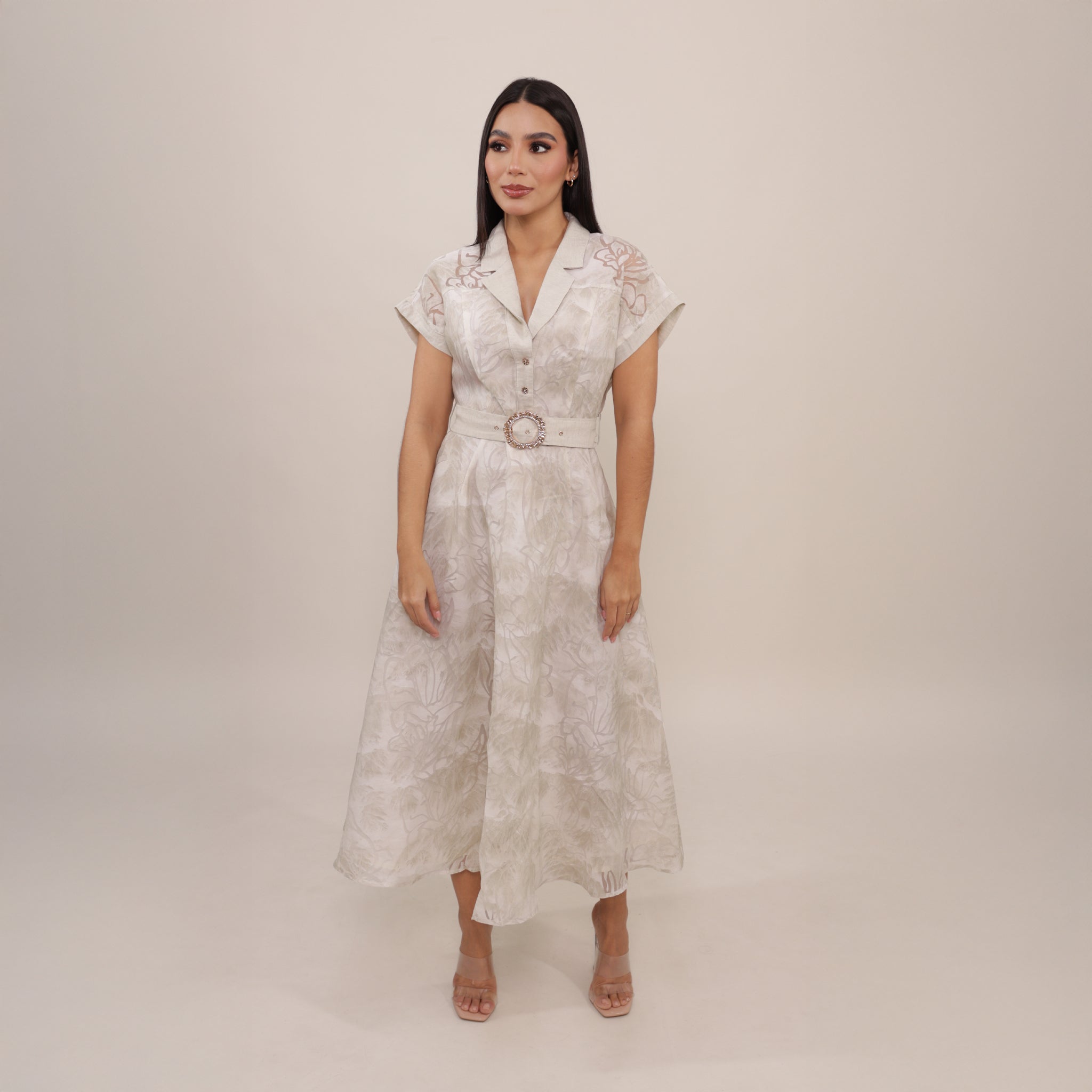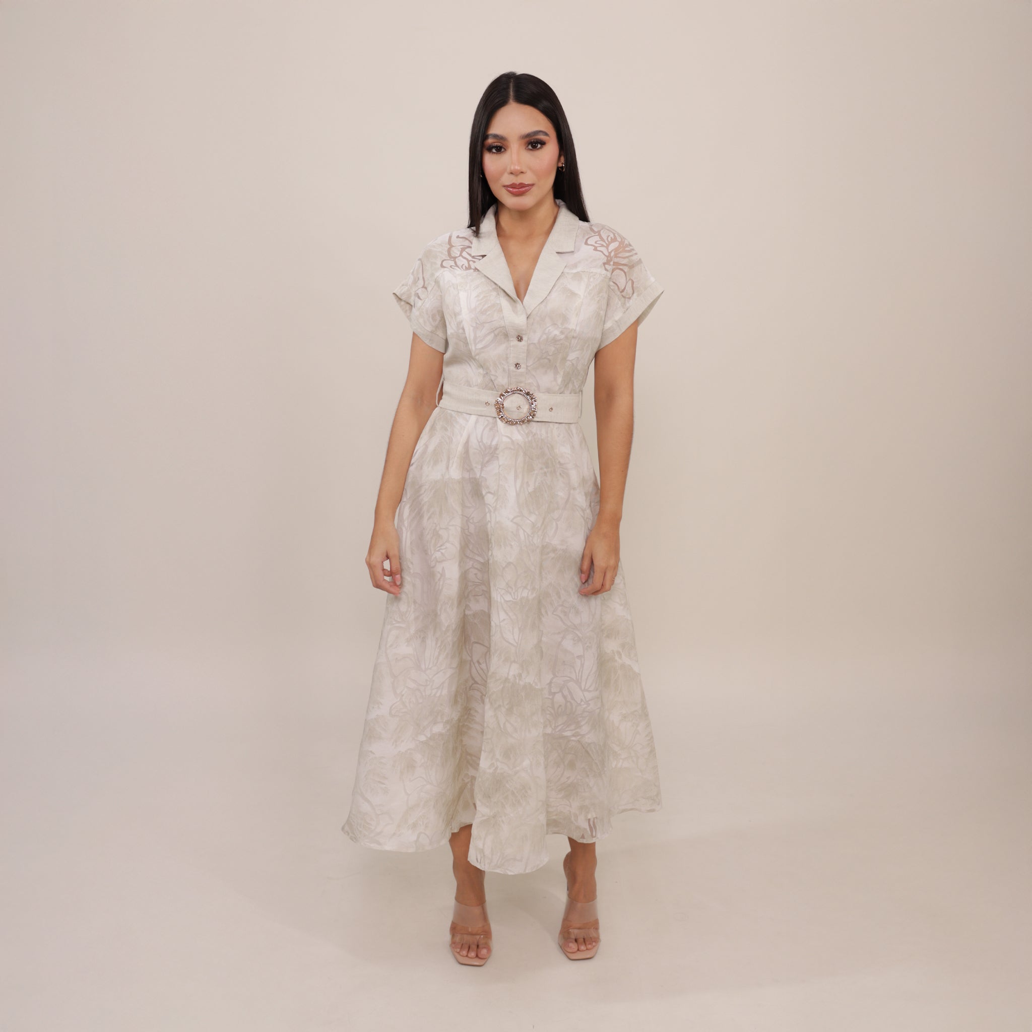 Este vestido camisero en tono crema con estampado sutil de inspiración orgánica es una pieza fresca y versátil. Su diseño de manga corta amplia, cuello tipo camisa y botonadura frontal le aportan un aire relajado y elegante. Incluye cinturón ajustable para definir la silueta, convirtiéndolo en la opción ideal para looks casuales.