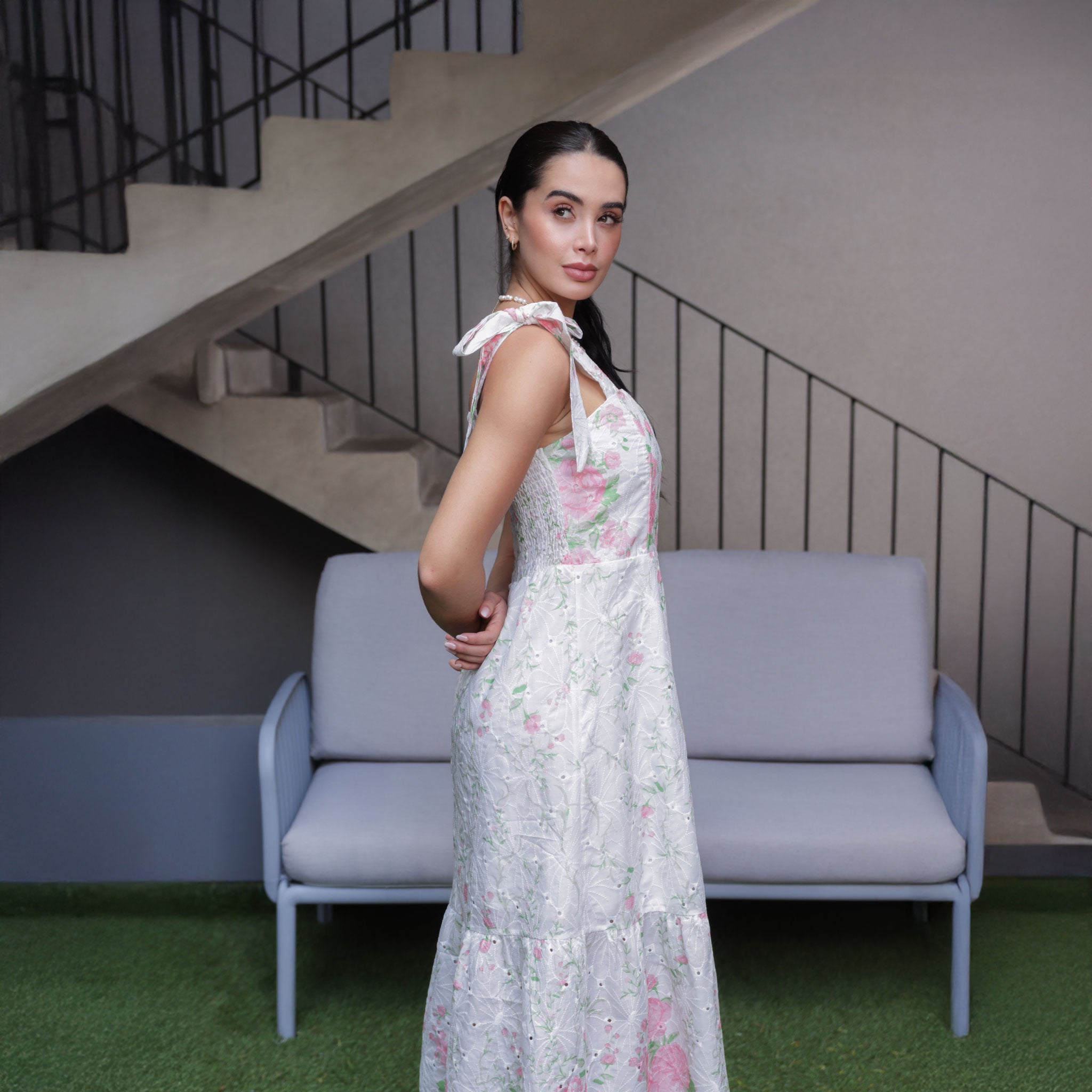 Vestido largo con estampado floral en tonos rosados y verde suave sobre fondo Ivory . Su diseño con lazos en los hombros y silueta fluida resalta la feminidad con un toque romántico y natural.