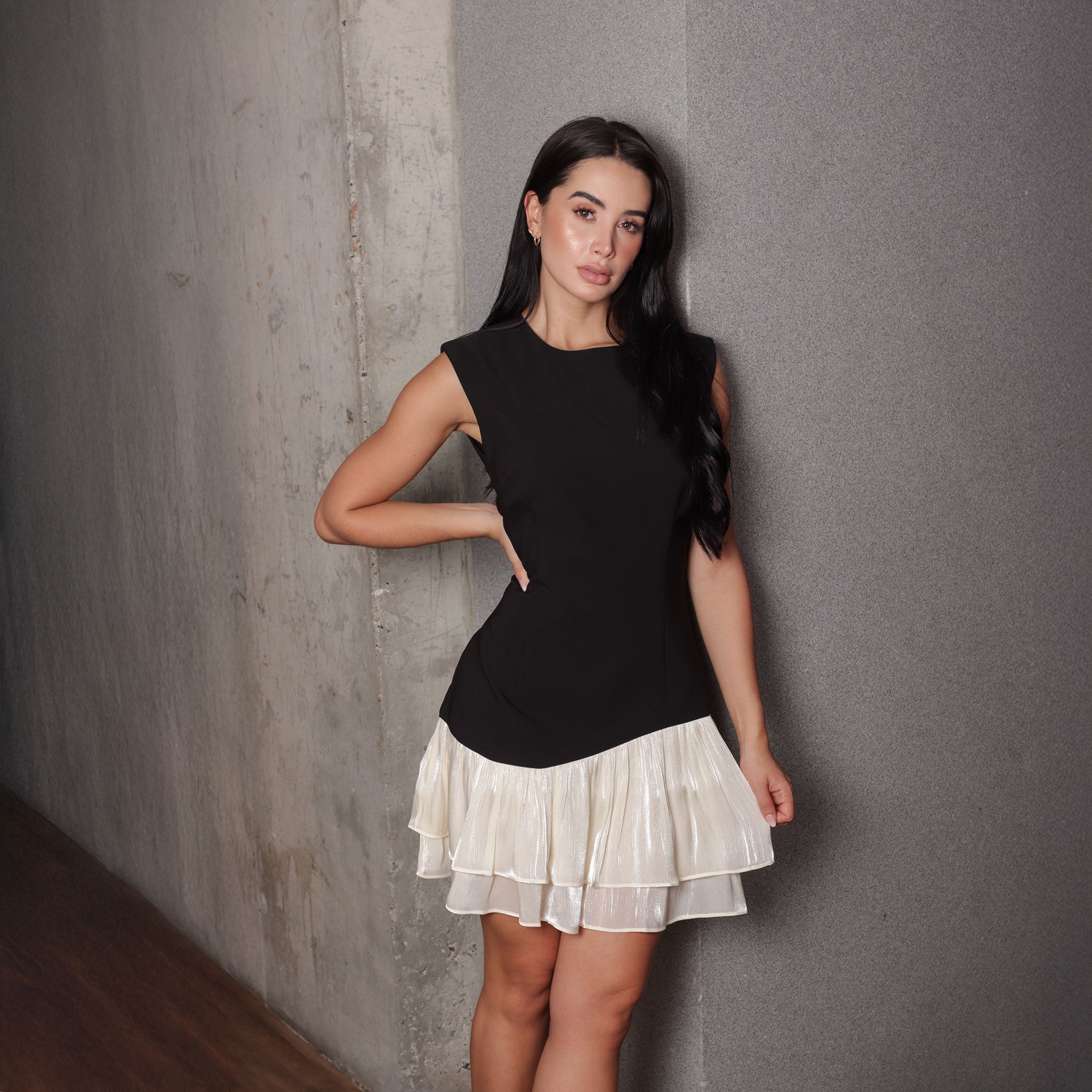Vestido corto en tono negro con falda de doble capa en satín perla. Su diseño sin mangas y silueta recta se combinan con el brillo sutil del ruedo plisado